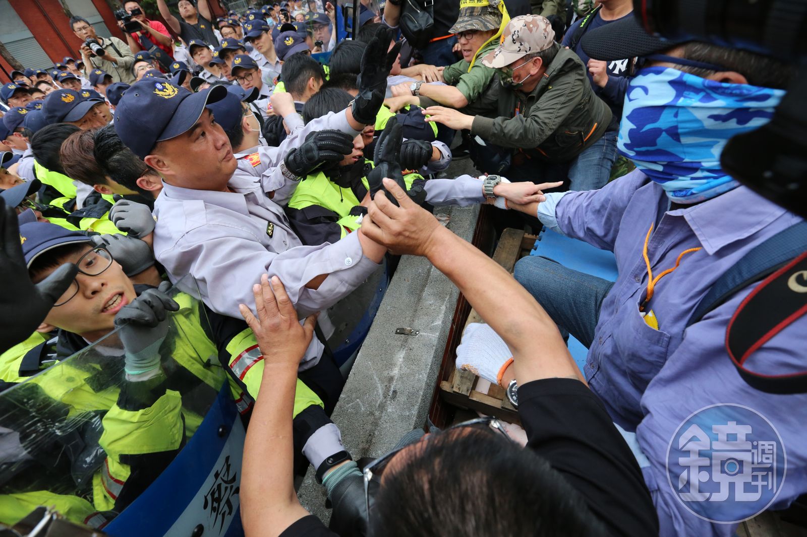 立法院今舉行《陸海空軍軍官士官服役條例修正草案》公聽會,反年改團體八百壯士今聚集民眾在立法院大門口,約在下午3點多發動攻擊,有人翻牆跳入,也有群眾衝破立法院大門,試圖衝入院區,不過被警方派出維安特勤隊制服,並用束帶銬住雙手,警方強力排除,也有多名警員受傷。