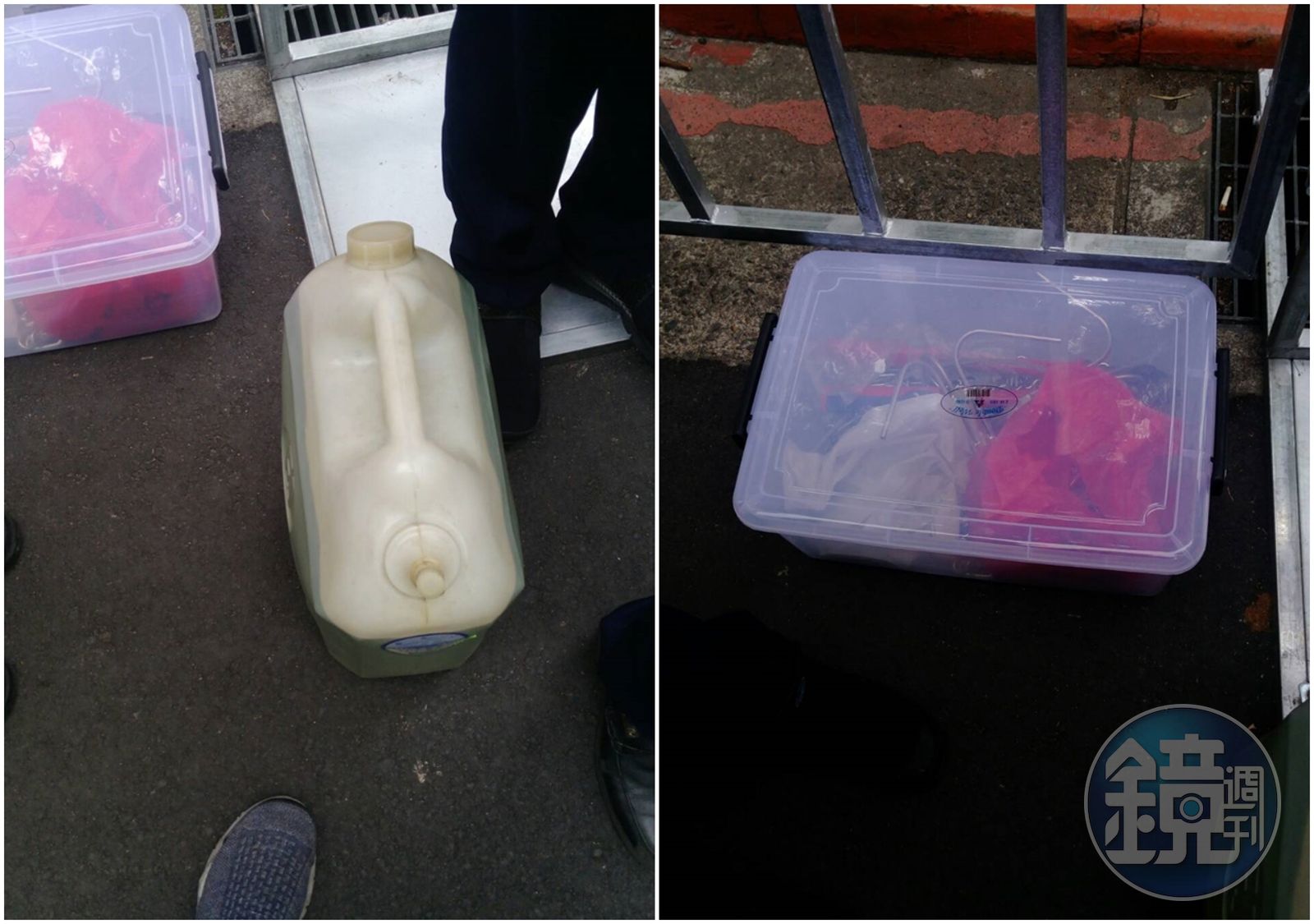 反年改團體集會遊行現場發現汽油桶1桶外,盒內裝有鐵鍊6條、油壓剪1把、鐵鈎6個等危險物品,遭警方扣留代保管。(警方提供)發布時間:2018.04.25 14:02 臺北時間