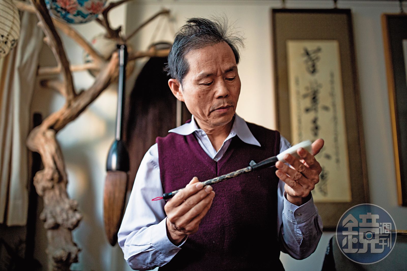 開玩笑問他,若真有龜毛,應該也會拿來做毛筆吧?「對啊,可惜烏龜沒有毛,但也許龜殼可以拿來鑲筆桿……」他回答時神情認真專注,完全是個如假包換的毛筆痴。