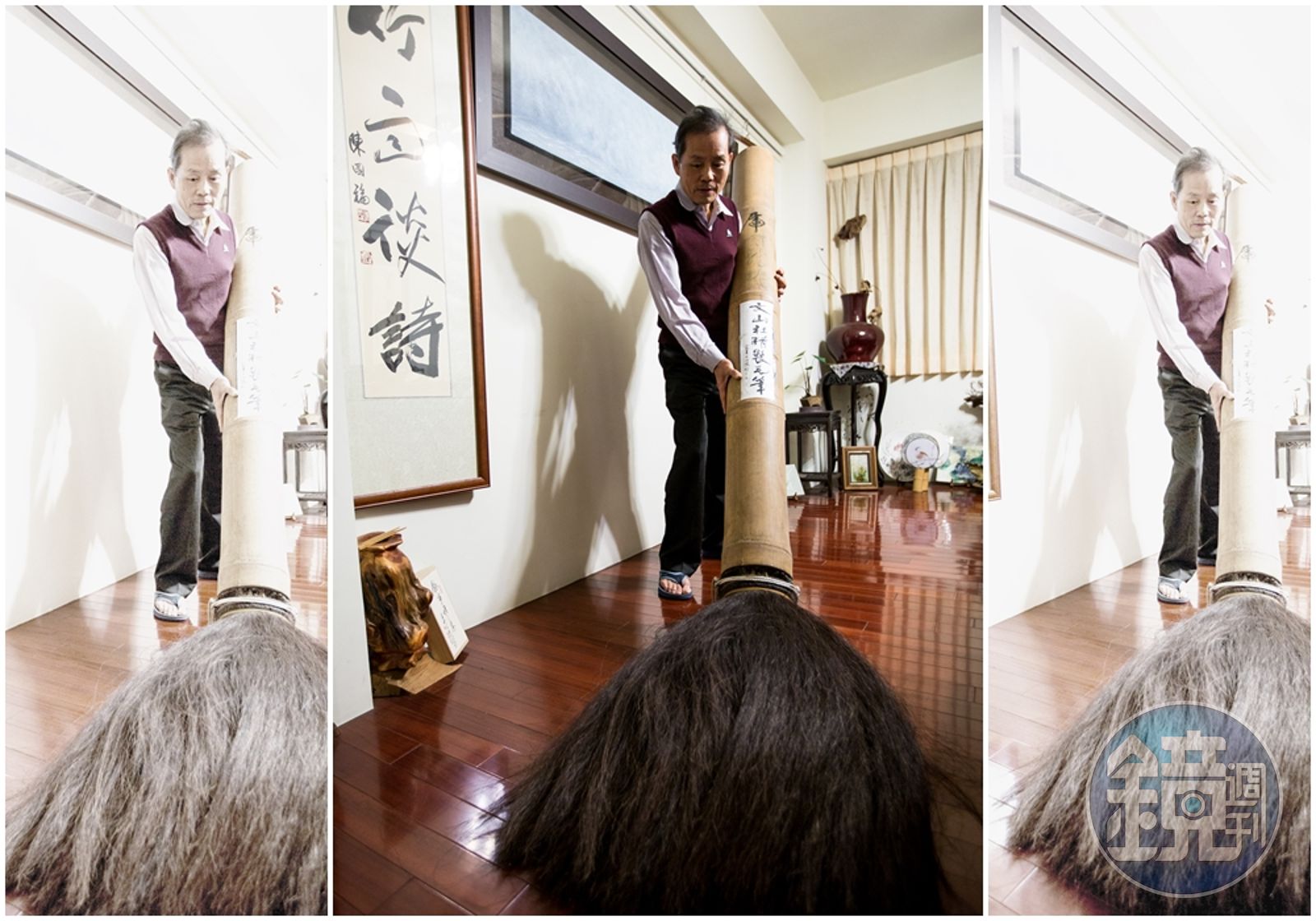 為了買足夠的馬尾毛量,陳耀文成了玉市常客,買了幾次之後,攤位老闆也覺得奇怪,問他:「你是樂器師傅吧?用來做弦樂的弓毛?」陳耀文搖搖頭,說自己是要用來做毛筆,「我告訴老闆我做毛筆用得比弓毛多,一匹馬尾巴可以做出好幾根弓,但我打算用100匹馬來做一枝毛筆。」