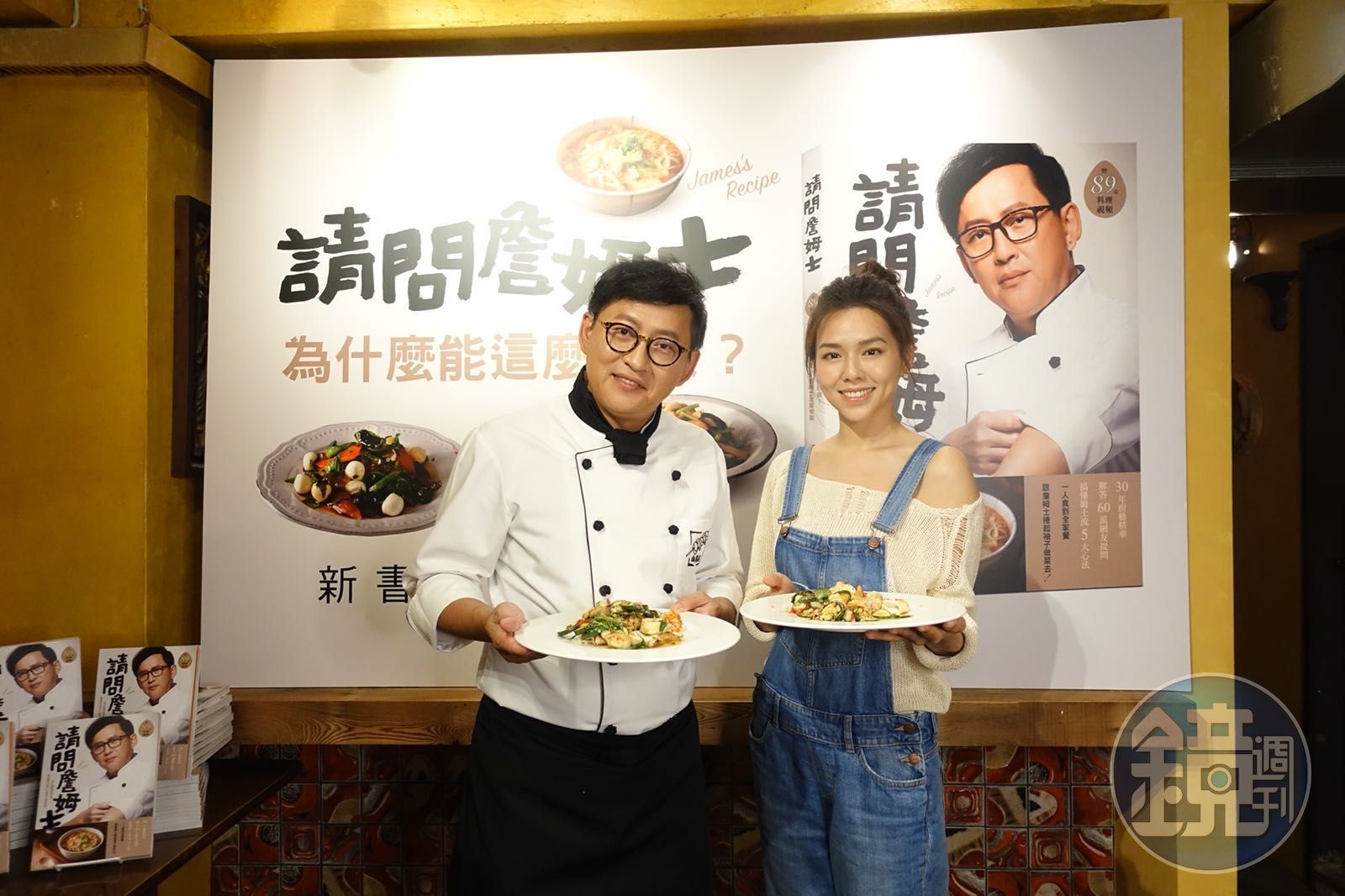 型男主廚詹姆士睽違3年推出新書《請問詹姆士》,教讀者料理技巧與邏輯,新書才上市,出版社立刻宣布已經緊急2刷,今天舉辦新書發表暨慶功記者會,老戰友夏于喬現身力挺,2人現場進行料理PK賽,讓粉絲重溫過去2人在節目上的合作。