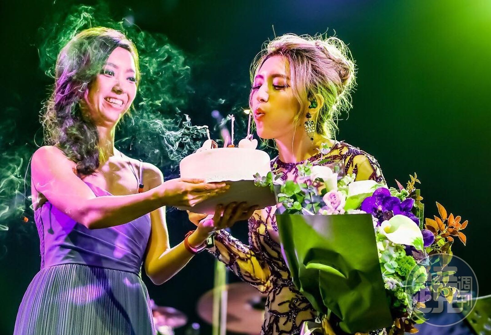 《女力爆發》演唱會現場,姊姊梁妍熙(左)驚喜端出蛋糕,為梁心頤(右)提前慶生。(海音國際、妹妹娃娃多媒體提供)發布時間:2018.04.30 17:16 臺北時間
