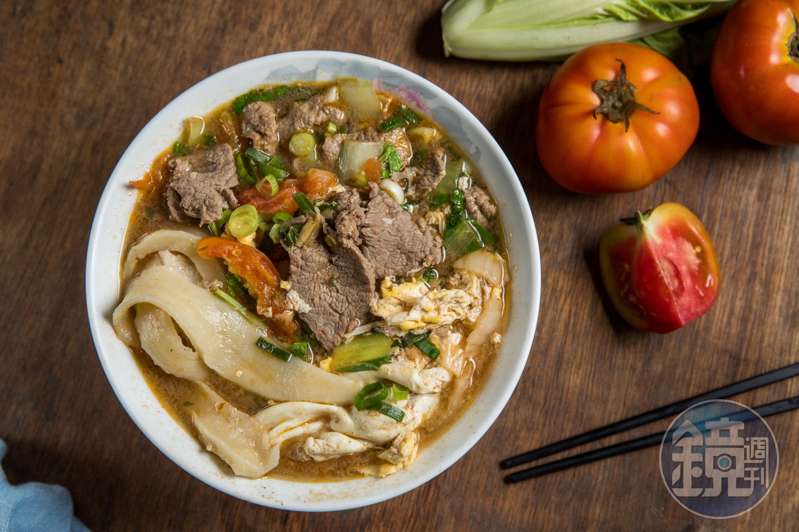 最受歡迎的口味是「番茄煮牛肉麵」,湯底用牛骨、洋蔥熬出自然甘甜,配料有黑柿番茄、青菜、雞蛋、現燙牛肉片,像個小火鍋一樣豐盛,刀削麵條的寬薄度約是一般的2倍,「剖面像菱形,中厚邊薄,中間吃得到麵的嚼勁,邊邊會吸湯汁。」老闆鍾權威解釋。嗜辣的,可以加點用泰國辣椒和豆豉炒成的辣椒醬提味,辣度頗高,要酌量使用。