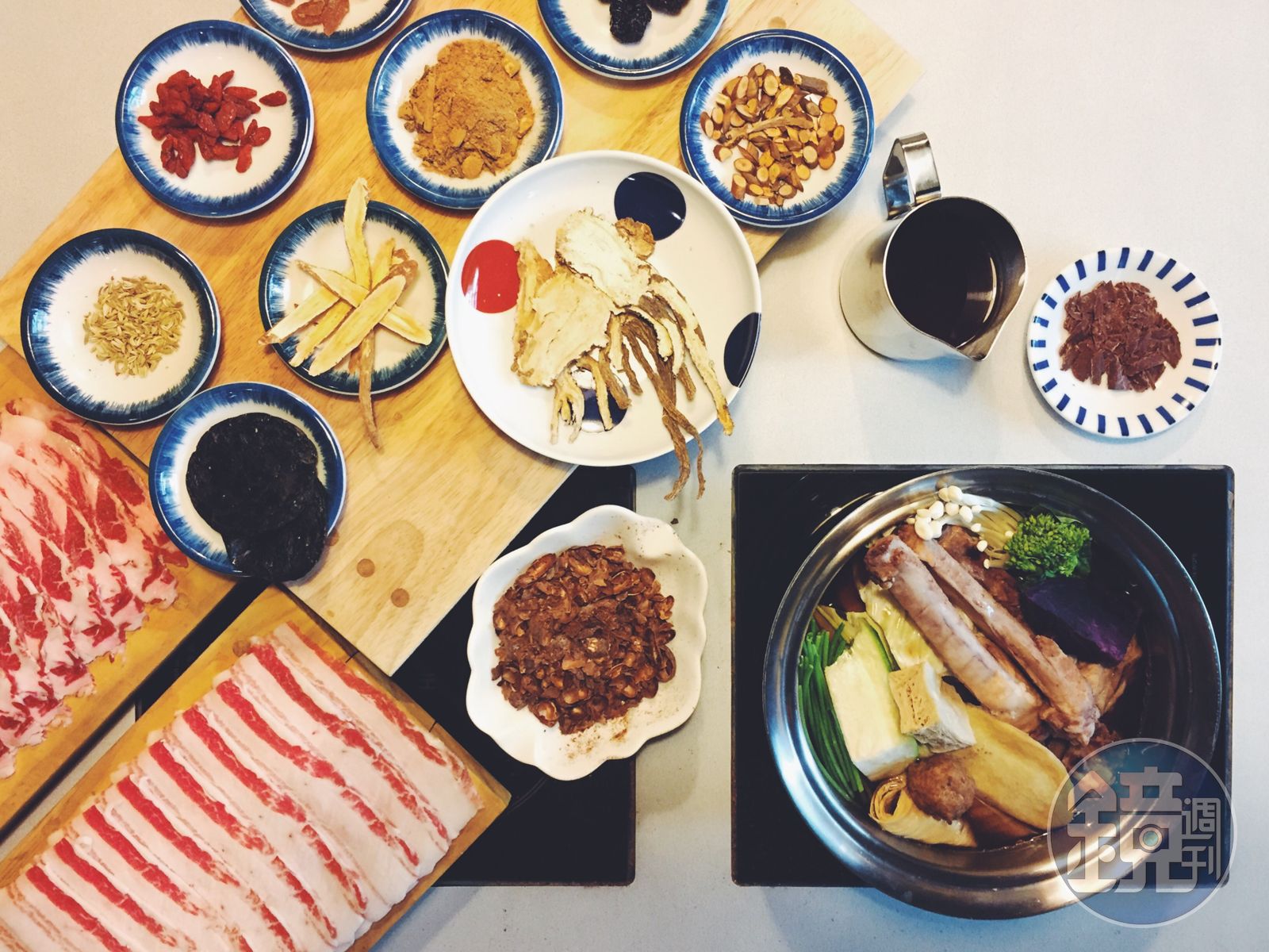 之後調高溫度,使巧克力絲融化在肉骨茶湯頭裡,品一口湯,會發現甘醇中帶有明顯的甜味,特別的是,甜味柔和,藥材味也不突兀,很適合涮煮油脂豐富的伊比利豬五花、豬梅花,或美國頂級安格斯牛翼板,能格外感受肉甜腴潤。最後一步,只要把剛剛預留的可可茶倒入湯裡,這時巧克力融出的甜味會稍微減弱,可以接續品嘗湯頭的第二種層次。