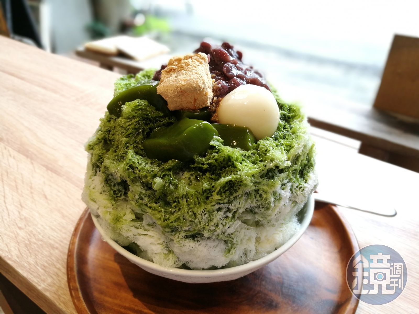 先點一碗「路過・老京都」,堆得高高如山的刨冰,上頭淋上抹茶汁、加上多種自製餡料:抹茶凍、紅豆、蕨餅和白玉丸子,光是擺盤視覺已很誘人,為避免冰山很快崩塌,店家建議可從最上頭挖起,微苦的抹茶與甜香紅豆是最佳拍檔,大顆白玉放入口慢慢咀嚼,具Q度的糯米丸子散發純米香氣,細嫩的抹茶凍和蕨餅也很迷人。
