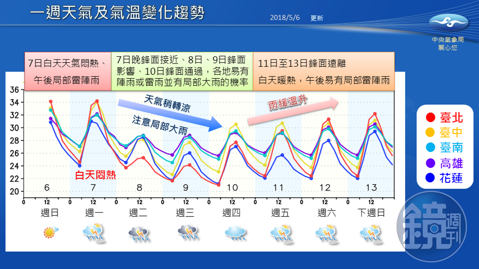 中央氣象局提供氣溫變化趨勢圖及一週天氣供民眾參考,7日白天天氣悶熱,北部上看34度,中南部也都突破30度,不過午後可能將有局部雷陣雨,晚間天氣也會隨著鋒面逐漸接近而有明顯變化,西半部地區天氣會變差。