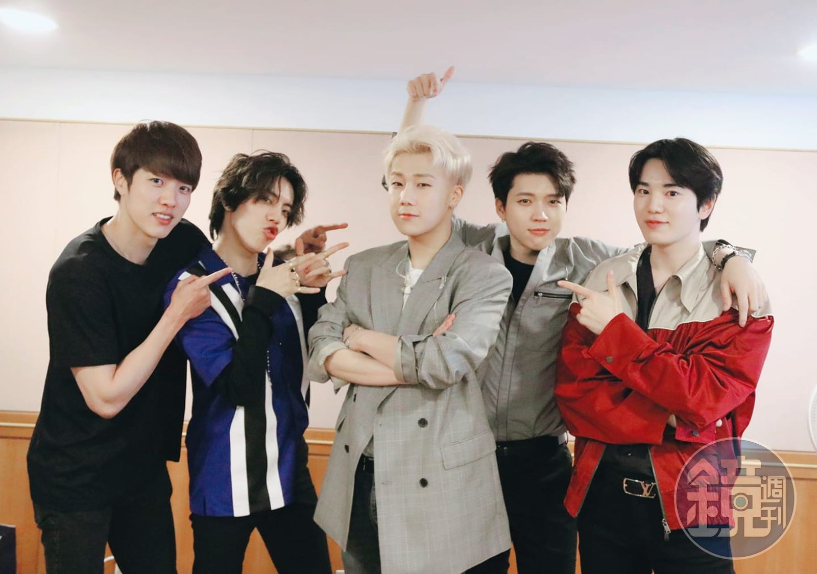 INFINITE隊長金聖圭(中)在個人演唱會上宣布下週入伍,成員在後台與他合照。(翻攝自INFINITE FB)發布時間:2018.05.07 19:06 臺北時間