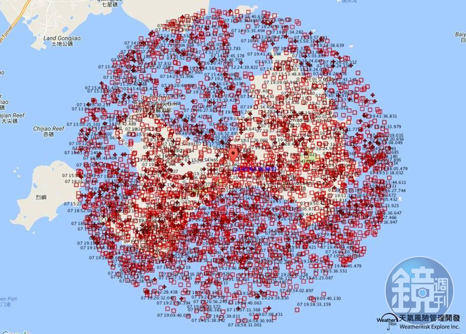 天氣風險(WeatherRisk)公司在臉書上貼出昨天(7日)上午11點到晚上8點之間,在金門附近的閃電累積圖。閃電的密集程度在圖象化之後看起來相當嚇人,還有網友留言表示太誇張了,「我還以為是什麼惡搞圖」。
