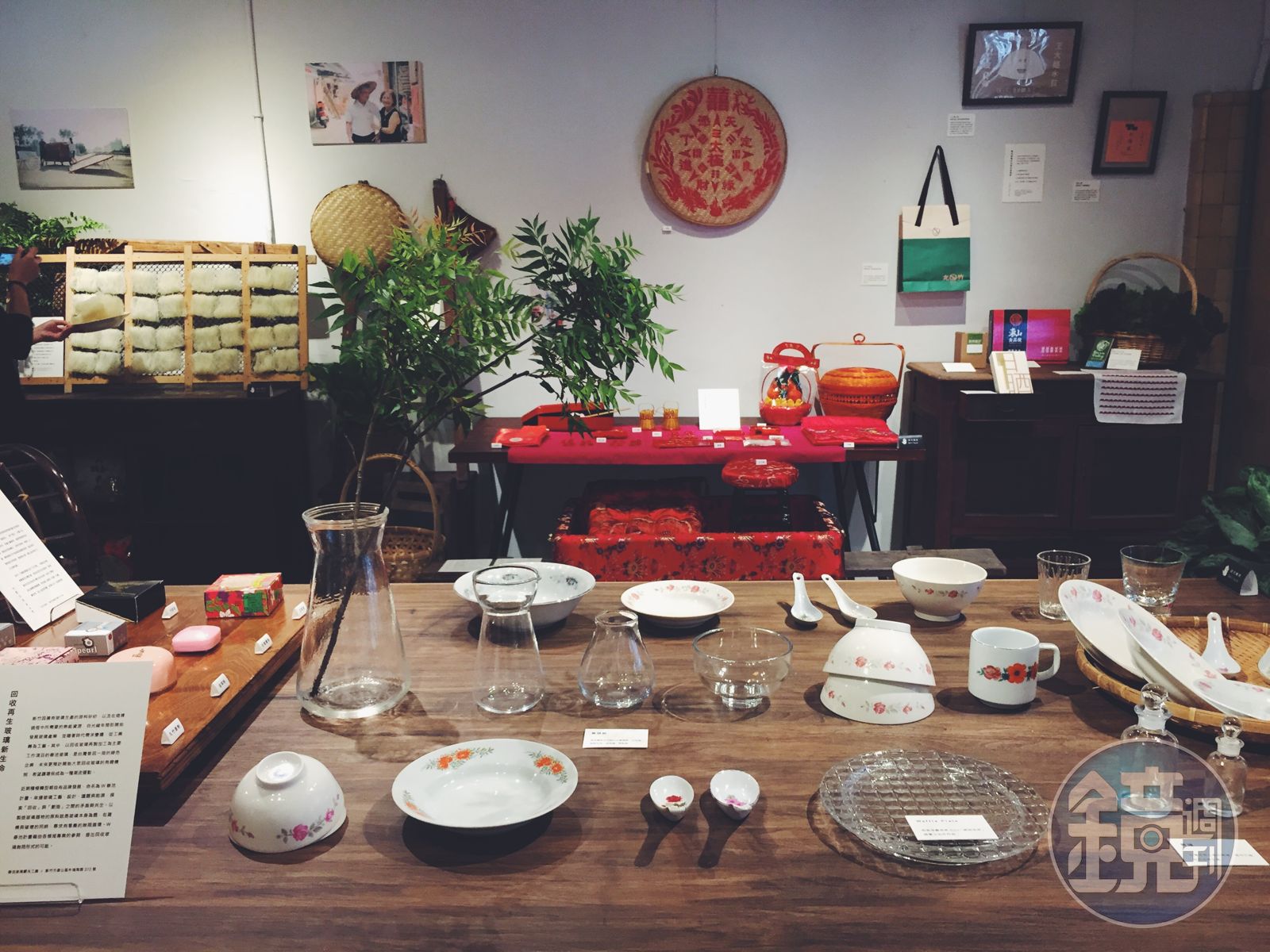 於是新竹市政府、蚯蚓文化、富錦樹合力策畫出「新竹商號」,以選物店的方式辦展覽,展出老店實物和主人們的照片,像是傳承至第四代的老鋪「鴻安堂藥房」的藥材和因應時代發展出的中藥防蚊包、日曬米粉「國際米粉」的縮小版、喜氣洋洋的「新竹嫁妝寢具」展列生子椅、針線盒、女婿兜、媒人花、婆婆花等舊時嫁娶用品,中間長桌擺進名店「丸竹化妝品」明星商品「金珠粉」「玫瑰蜜粉」,在商號裡通通看得到,而來自「鄭榮錦商行」的復古餐瓷,不但給看,還能買回家。