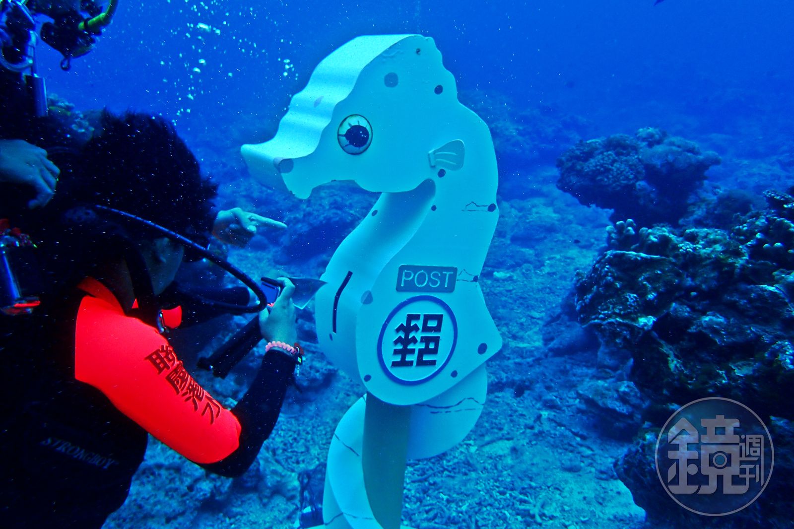 負責海底工程的飛魚潛水訓練中心俞明宏說:「要把一個人工的東西放入自然的海底,必須做出多重考量,再以最不破壞的方式進行,光是選地、勘查就花了好一段時間。」為了讓郵筒能長期待在海中,選用耐酸鹼及水溫變化的316不鏽鋼材質,並設在岩盤之上。
