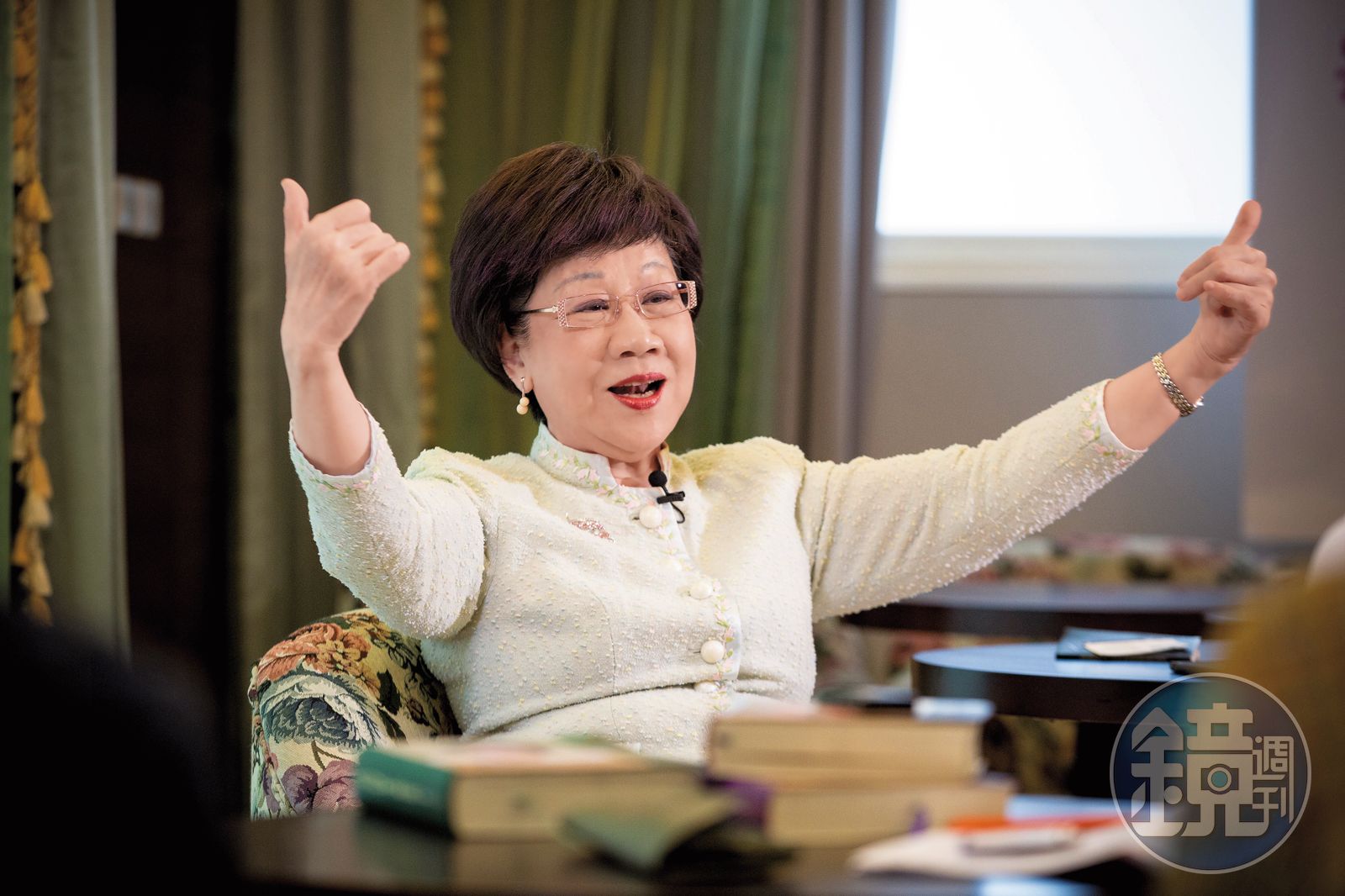 與其說是專訪,不如說是政見發表,她陳抒己見,數據清楚,條理分明:姚文智主張松山機場撤遷,擔任過8年副總統的她,說松山機場與大直的國防部連成一線,有國防考量,機場撤遷原址改建公園,閒雜人等隨意進出,萬萬不可;她提及桃園經驗,劉邦友血案之後人心惶惶,她努力招商,減少財政赤字;當然,也不忘批判柯P,說他作秀比做事還多,整天KUSO,把年輕人的未來都蹉跎掉了。