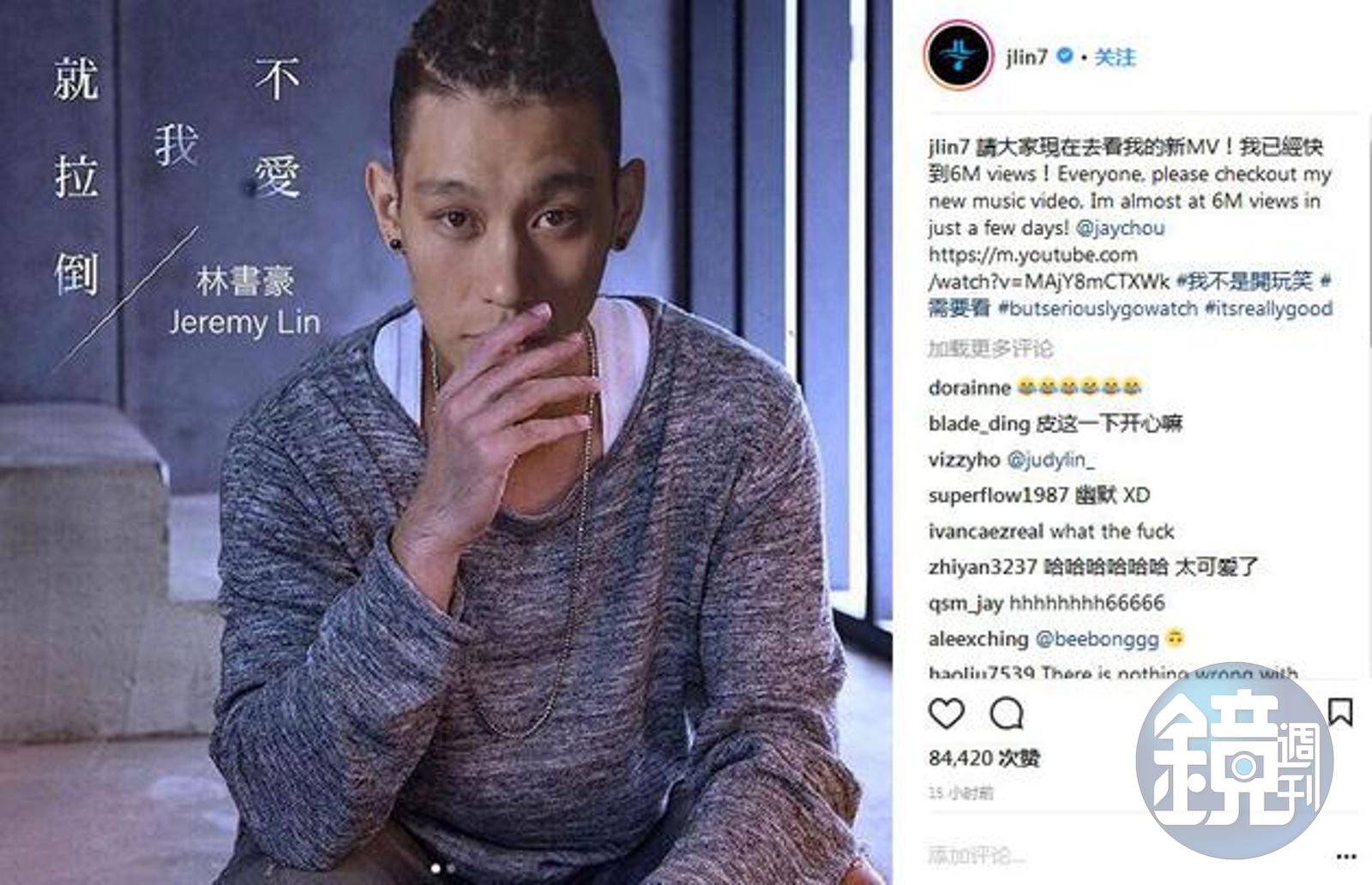 日前林書豪透過IG發佈了一張自製周杰倫最新單曲〈不愛我就拉倒〉的圖,有趣的是林書豪將周董的頭像換成了自己的,名字也從周杰倫換成了林書豪,並在下面配文:「請大家現在去看我的mv,我已經快到6M views!」除了搞笑,也有力挺好哥們周杰倫的意味。