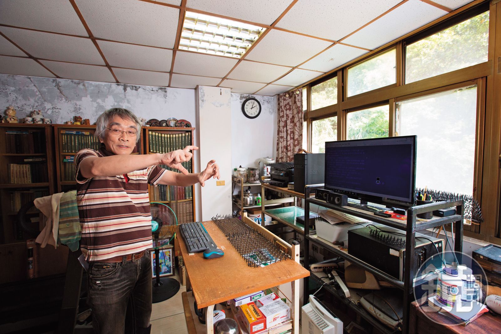 為了不傷脊椎,他從30歲開始站著寫作,鍵盤有專屬架子,還擺著一條黃長壽菸,架子高度略嫌太高,這可能是他老聳著肩膀的原因。而後頭的檔案櫃上,放著三具祖父的皮箱。