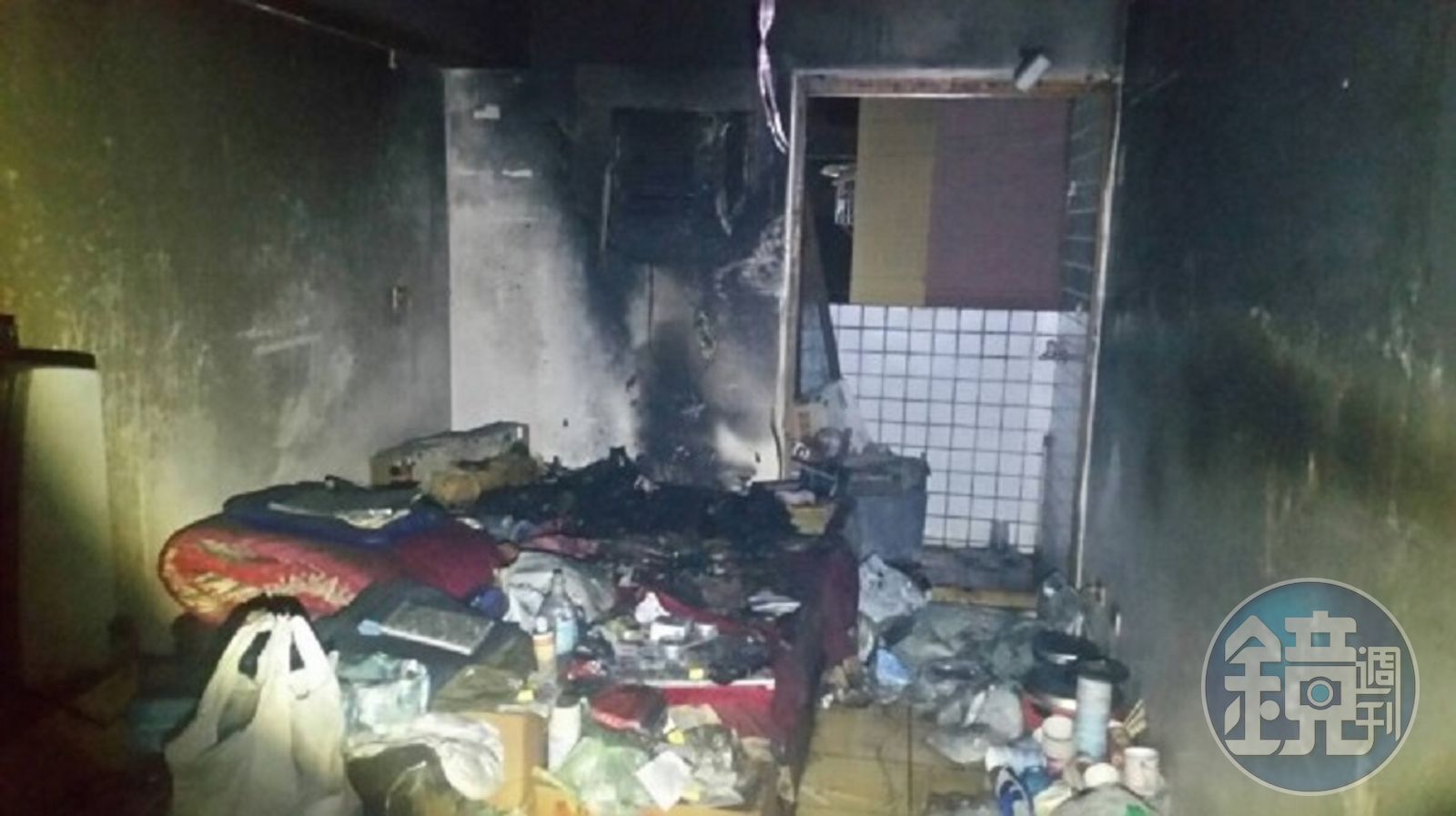 於是消防人員拉起水線,直衝4樓,破門而入後,發現屋內有悶燒的痕跡,地上有餘燼,且屋內雜物凌亂,消防人員先噴水撲滅火源,進一步搜救時,發現吳姓老翁倒臥床舖旁的地板上,床舖一小角有燃燒痕跡。