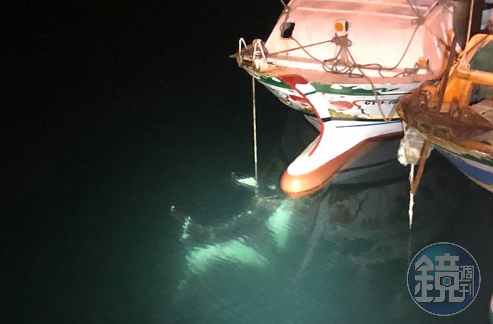 陳姓漁民昨晚駕駛新隆興號漁船,出海捕捉小管,在離岸邊不到2公里處錨泊,卻意外被鬼蝠魟雙鰭中一鰭卡在繩索上,2度放鬆繩索想將其野放,卻因鬼蝠魟相對施力,導致繩索愈拉愈緊,最後只能將牠帶回鎖港漁港。