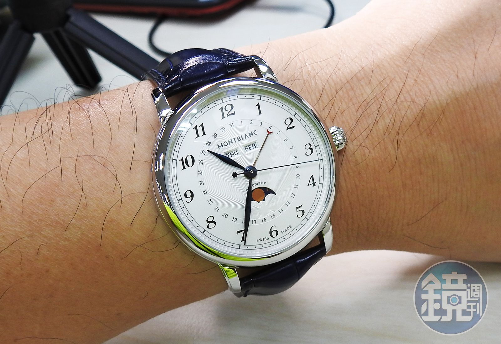 神祕的紙袋出現在我的桌上,萬寶龍的商標與「小白星」格外耀眼…黑色紙袋裡面拿出來一個白色紙盒,除了熟悉的Logo外,那獨特的「白」也讓人充滿期待…從白紙盒抽出來的錶盒和說明書,看看它與筆電的比例,其實體積不小!話說那本說明書也厚得有點誇張。掀起了你的蓋頭來,然後只看到反光…冏沒關係靠近一點看!「Star Legacy全曆腕錶」全貌現身。然後右下角的那個神祕「星星」是?原來是原廠所附的塑膠「壓棒」。因為這款腕錶的日期、星期、月份、月相都可以單獨快調,所以才會貼心的附上這項小工具喔!不過它實在是有點小,要注意不要遺失,不然就只能用牙籤代替了…換個角度瞧瞧!可以看到它多層次的錶殼工藝,以及充滿立體感的面盤配置。真正的燒製藍鋼指針長這樣!其質感不是電鍍或烤漆可以比擬的。以萬寶龍標誌性六角白星放射出去的機刻雕花圖案,搭配月相顯示堪稱「星月同輝」!(像素不足,宅編該換相機了嗎?)星期、月份顯示視窗特寫。小地方的作工其實也頗為細緻,不過右邊的月份顯示視窗好像稍微大了一些?是宅編的錯覺嗎….錶殼右側特寫。可以看到鑲有琺瑯萬寶龍白星的錶冠,以及錶冠上下的隱形按鈕。前面先行曝光的壓棒就是拿來按壓隱形按鈕、快調功能用的。欣賞它的面盤真是一大享受!請注意它那浮凸的阿拉伯數字時標。然後強烈建議去買一個珠寶放大鏡,好隨時鑑賞這款腕錶的面盤工藝。錶耳部分的拋光難度不低,也是考驗品牌工藝的一個「魔鬼細節」。可以看出它這部份確實也做得一絲不苟!錶帶則是由位於義大利佛羅倫斯的萬寶龍Pelletteria皮件工坊所打造的藍色暈染鱷魚皮錶帶。錶殼左側特寫!另外兩個隱形按鈕位於此處。錶扣為雙開蝴蝶扣設計,有兩個安全按鈕,需同時按下才能開啟錶扣,安全性還算不錯!注意錶扣上有MONTBLANC字樣裝飾。錶扣全開後的樣子。可以看到錶扣的構成部件均以金屬塊切削而成,而非廉價的衝壓零件。錶帶內側襯以透氣軟皮,上面壓印有義大利佛羅倫斯萬寶龍Pelletteria皮件工坊的標誌。透過藍寶石水晶錶背,可以一窺其MB 29.12自動上鏈機芯(ETA基礎)的靈巧運作。話說宅編「個人」覺得以近15萬定價等級的腕錶來說,它的機芯裝飾應該可以再細緻一點才是…就以上手照來做為結尾吧!話說它的錶徑雖然有42mm,但或許是因為造型頗為「斯文」的關係,看起來好像沒那麼大呢! MB 29.12自動上鏈機芯/不鏽鋼材質/時間顯示;日期、星期、月份、月相顯示/藍寶石水晶錶鏡、底蓋/防水30米/佛羅倫斯萬寶龍Pelletteria皮件工坊藍色暈染鱷魚皮錶帶/建議售價:NT$147,000