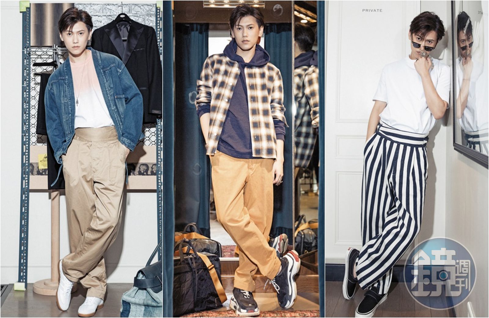 這套look就是要人注意到我的條紋褲。我非常喜歡條紋,總覺得穿上後,會有腿比較長的視覺效果;我的腿比較細,絕不能穿很軟的材質,小時候如果買到比較軟質的牛仔褲,我會去上漿耶,一定要讓褲子是硬挺的型才可以。