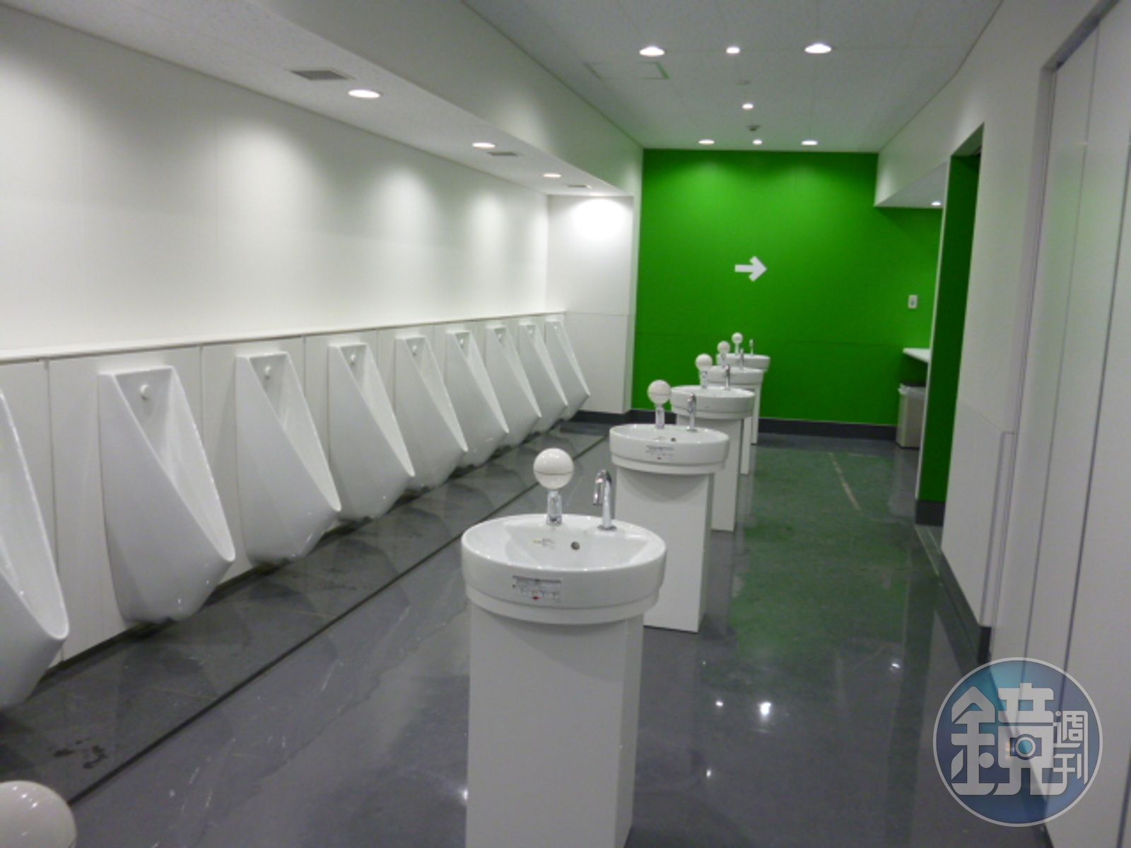 該球場主看台附設的廁所,一排排男性小便斗、洗手台和隔間入口,從左、中、右側並列。每座隔間裡牆壁開門時呈藍色(男廁)或紅色(女廁),一關門便會轉白,讓使用狀況一目了然。空間的入口和出口是分開來的,使用者如廁完畢,洗完手,便能直線走向出口。廁所一經整修,人流自然順暢了起來。