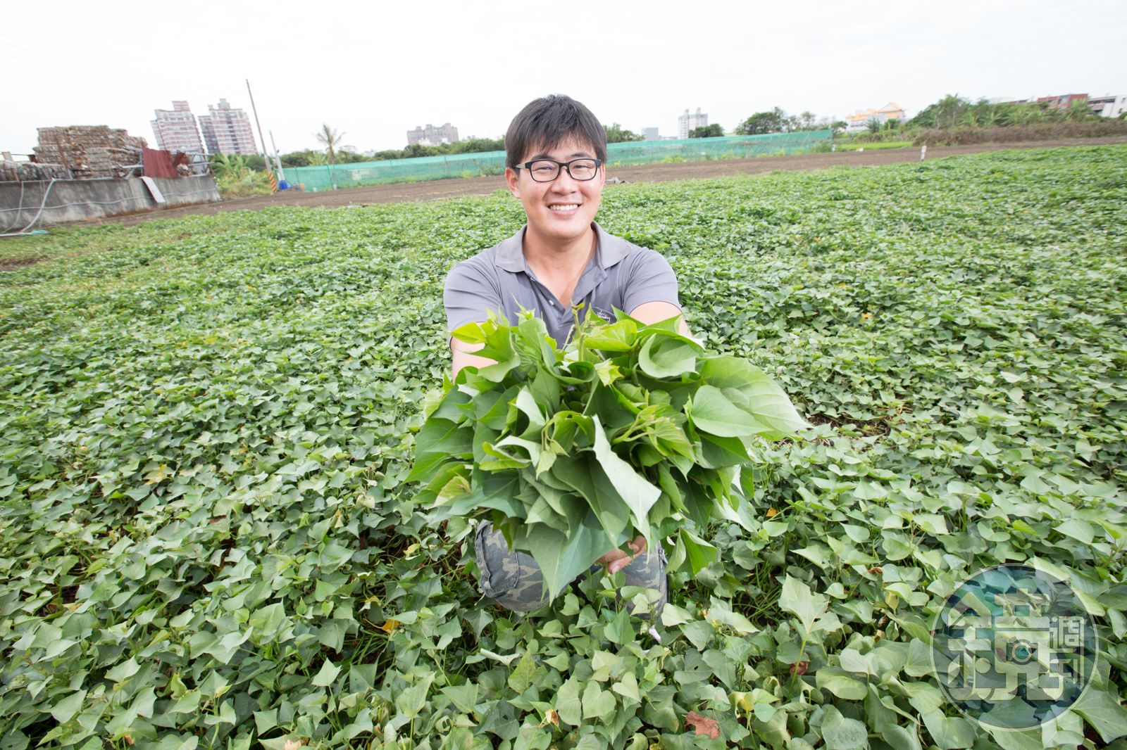 田裡種的主要是地瓜葉:「大家嫌地瓜葉便宜,不種,可是這個菜一種下去,可以長2年,不像高麗菜,一次收成就要重新再播種。」他說自己懶惰,而懶惰是世界進步的動力,他種菜的最高法則就是:「種下去可以一直長。」所以,他也零星種了皇宮菜、茄子、玉米筍等,這些菜全是種下去,可多次收成。