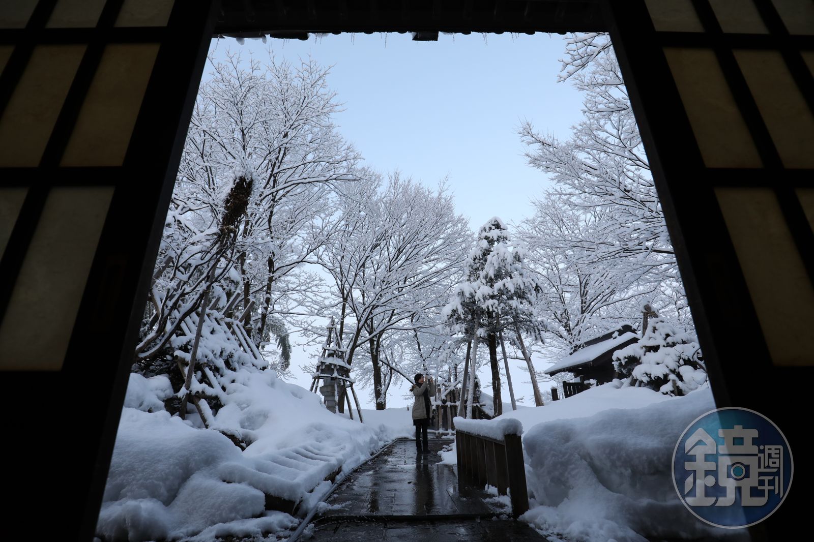 古老民宅的建築,僅有6個房間,雖無獨立衛浴,得瑟縮著快步穿過木板長廊,才能到大浴池泡個熱水澡,但每個房間深處都是大片落地窗,你可以一邊欣賞屋外風景,一邊在案前看書、烤火煮茶,光是這如水墨畫般的雪景,剛才的一點凍寒也就不值一提了。