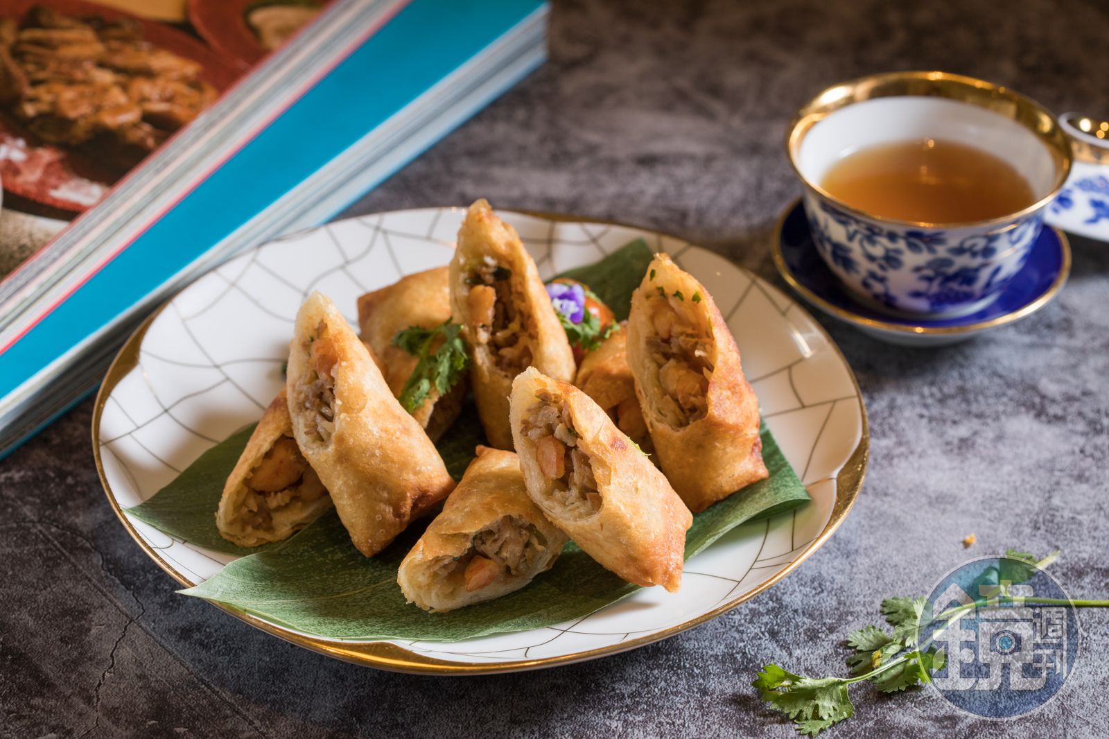 例如看似平凡的老菜「扁魚春捲」,竟是主客間的優雅暗號。「它會排在第4到第6道上,提醒座上賓可以中場休息,離席上廁所或抽煙,師傅也會停一下再出菜。」蔡瑞郎解釋。包裹扁魚、銀芽、蝦仁、肉末的春捲,在油鍋裡炸到酥黃脆口,蘸著清雞高湯吃,鮮香不膩,讓人一再貪嘴。