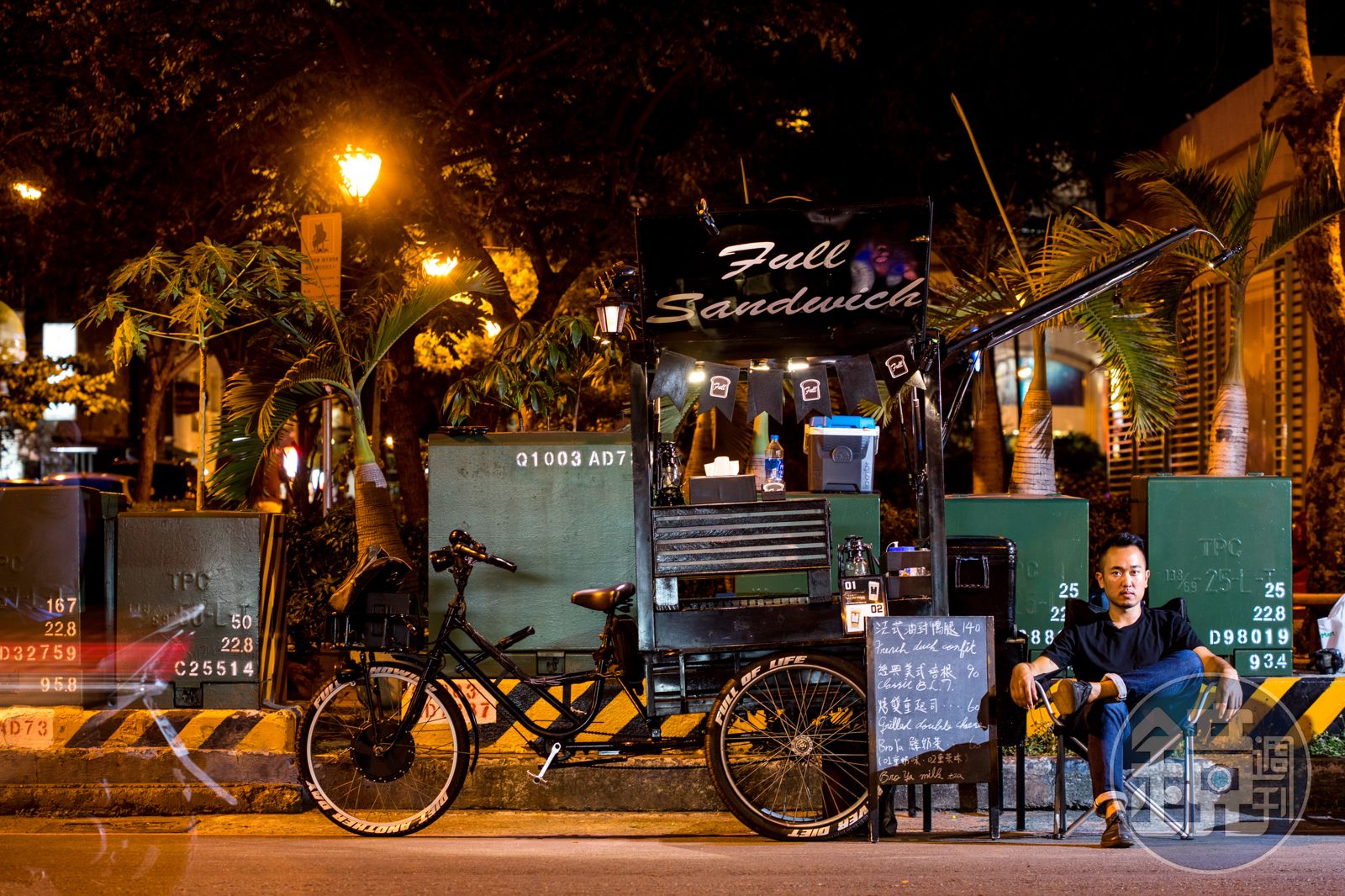 一開始選擇做三明治,一方面是自己愛吃,同時考量客人方便攜帶,本來想做的是胖卡餐車,但在考量預算之後而做罷,正當苦惱時,一位阿伯騎著資源回收三輪車經過,讓他有了新想法,心想,不然來試試看?於是四處去找人力三輪拖車,自己動手設計改裝,足足花了半年才開張,然而,第一天騎出去即發覺車子太重,騎不到預想的目的地,索性就在半路社區小公園做起生意直到現在。
