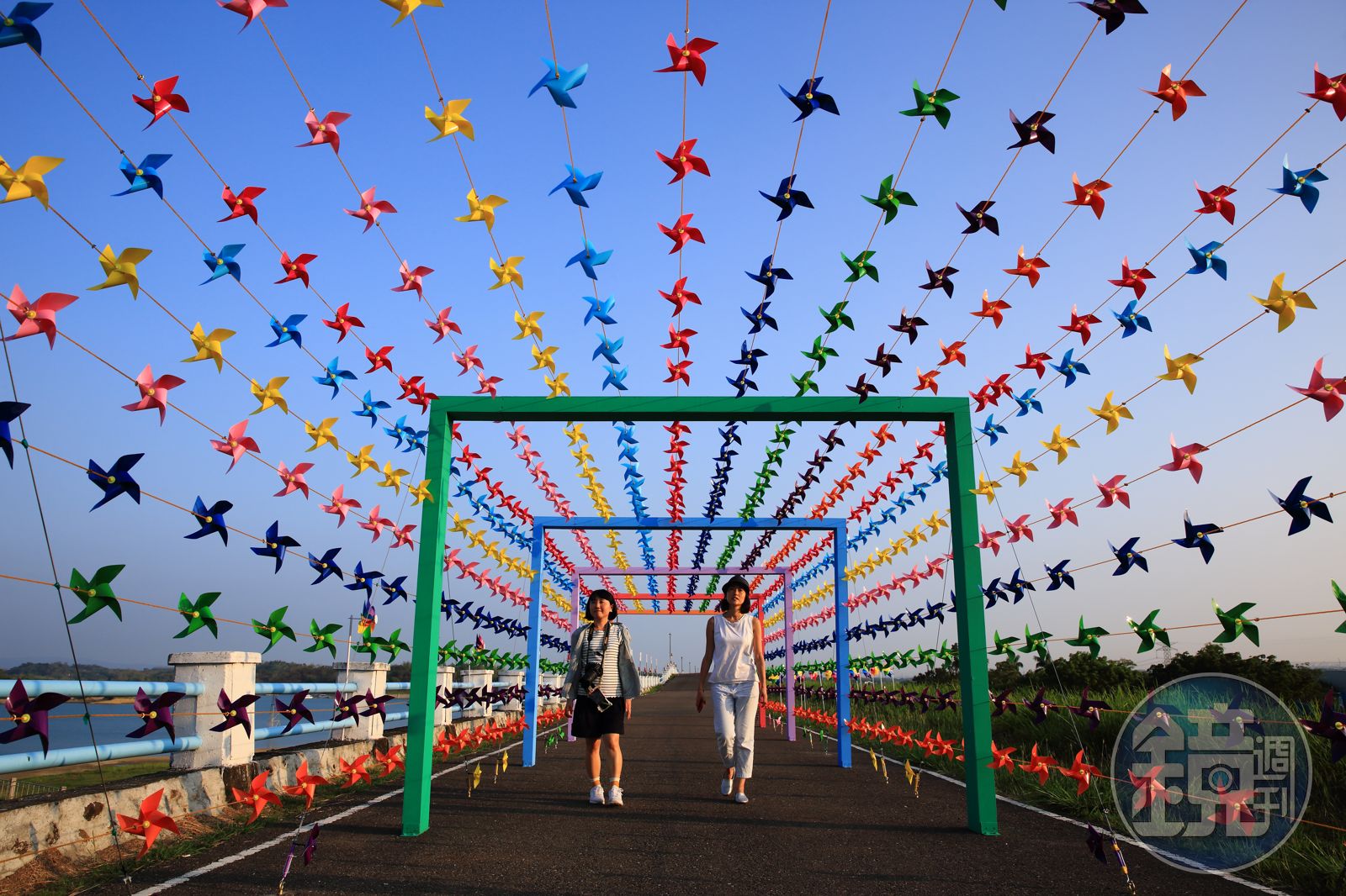 以風車為主題打造的藝術裝置,有水漾風車隧道、水漾蝴蝶牆、福氣貓頭鷹風車區、大風車區、風車帆船、幸運輪轉風車區、幸福風車海等。最受歡迎的打卡點「水漾風車隧道」,是由6座馬卡龍色彩的拱門串起,牽起一串一串的風車。