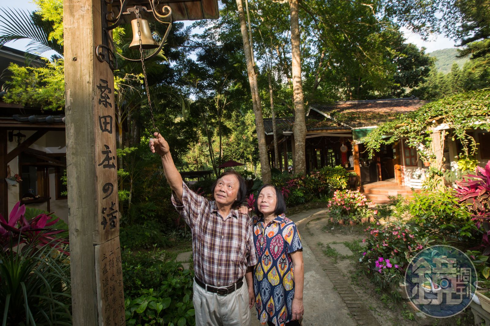 領著退房客一家人走出花園,陳智夫依慣例敲響3聲大門上懸掛的鐘,大聲朗誦:「願意謙卑與包容,尊重大自然,疼惜大地與生態,祝福全員旅途平安,家庭幸福美滿。」亦步亦趨跟隨主人的愛犬「駙馬」又叫又跳,滿園子蝴蝶、蜻蜓紛飛,像是加入熱熱鬧鬧送別行列。