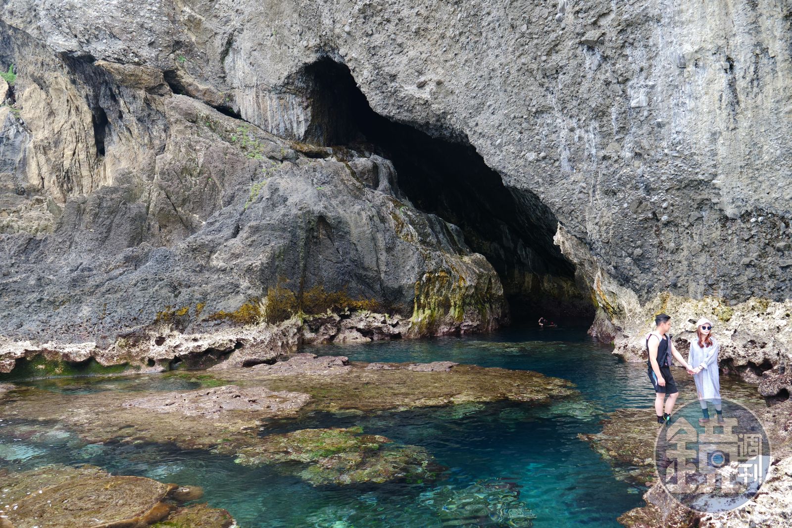 最遠也最神祕的就是「藍洞」,也是IG上熱門的祕境打卡地。通往藍洞必須走一段礁岩地形,由於是沿著岩壁與海濱之間行走,因此只能在退潮時前往,一旁盡是海天一色的藍色景致,步行約10分鐘即可到達藍洞。