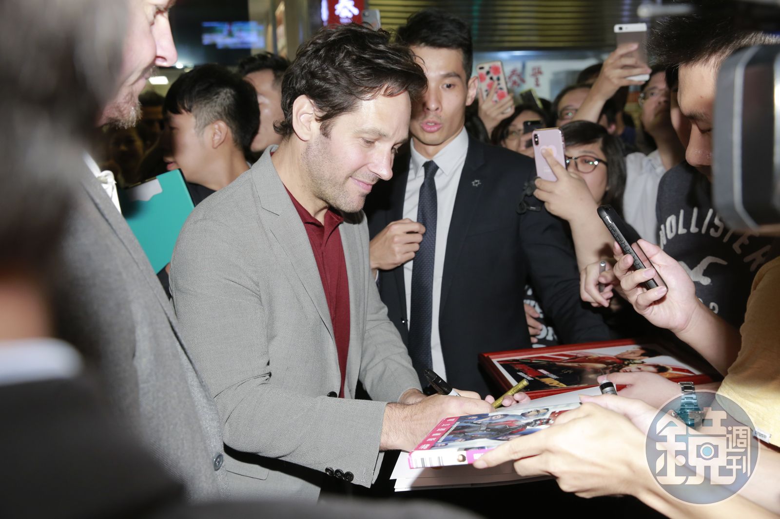 飽餐一頓後穿著與早上記者會同樣服裝的保羅路德步出店門,大批追星影迷及圍觀路人早已等在門口,有人帶來Q版蟻人公仔,也有人帶來保羅過往作品的DVD請他簽名保羅來者不拒,掛著微笑一一滿足迷弟迷妹心願;而伊凡潔琳換上了時髦的褲裝,同樣笑容滿面地走出餐廳。