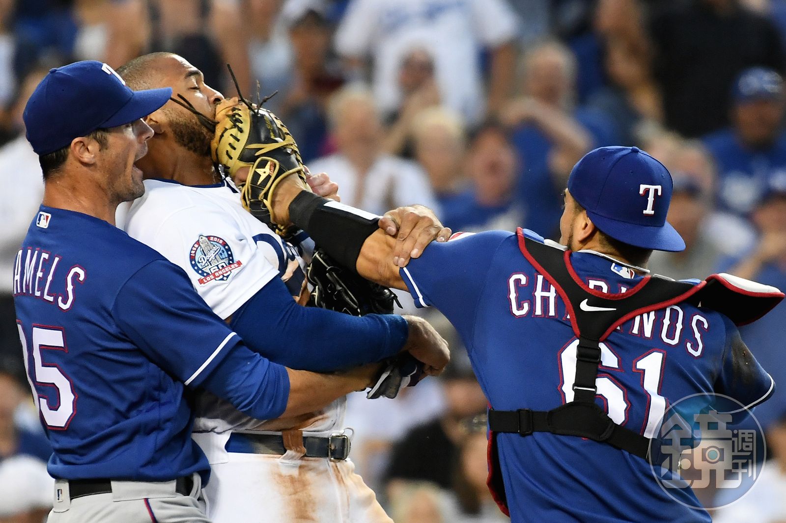 3局上雖被對手敲出首安,不過前田健太馬上回穩,迅速抓下剩餘出局數。第3局下半,道奇在2人出局情況,坎普(Matt Kemp)見隊有敲出安打試圖跑回本壘得分,由於外野手快速回傳本壘,坎普眼見將被觸殺,竟出現犯規動作衝撞捕手奇里諾斯(Robinson Chirinos),隨後2人扭打成一團,甚至還讓雙方一度清空板凳,在場上互相叫囂,最後2為事主遭到驅逐出場。