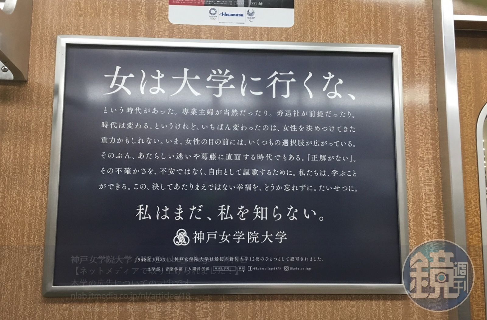 有日本學生在搭乘阪急電車時,看到偌大的廣告看板上斗大的字寫著「女生別讀大學」。(翻攝神戸女学院大学Twitter)