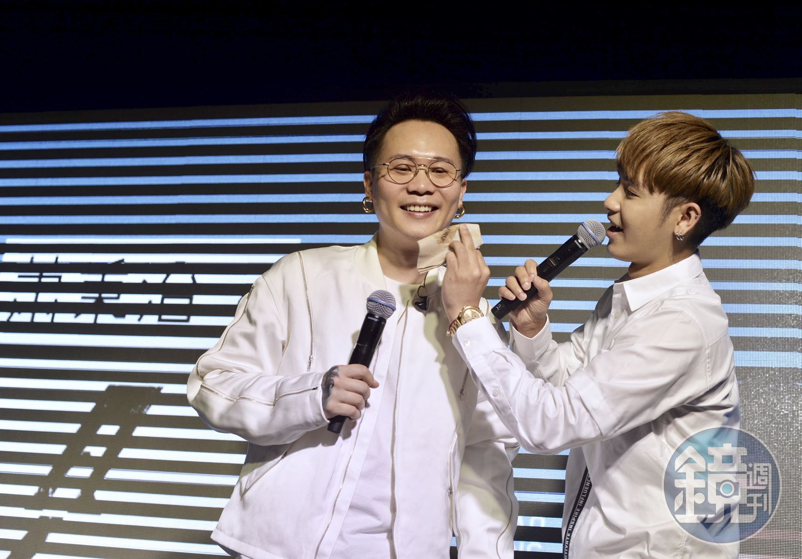 上了台立刻先幫蕭秉治擦汗展現體貼,轉頭卻要歌迷多到蕭秉治的社群網站留言,因為「他其實很喜歡看留言,尤其是對作品的心得,他都會記在心裡」,當場把蕭秉治的玻璃心公諸於世。接著鼓鼓又送上超大肉粽應景,又大開玩笑:「為什麼給他這個,因為這個人在團裡餓不得的,不是上廁所就是吃東西。」讓蕭秉治哭笑不得。