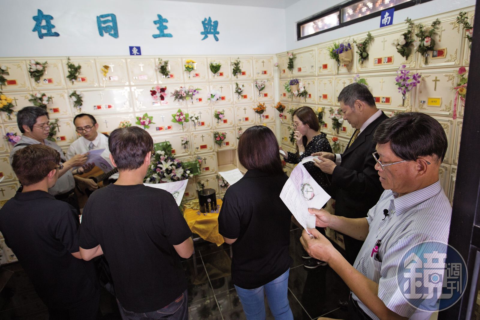 這天,善願志工在門口接待,公祭單與簽名冊一片空白,彷彿無人出席的告別式。電子看板輪播著立委與市議員的輓聯,靈堂前花團錦簇,署名皆是「善願愛心協會」。偌大的告別式場中約莫20排座位,同樣空蕩蕩,只有亡者的女兒、大哥與二個妹妹出席家祭。另名志工、善願執行長吳倪冬月輕摟著亡者女兒的肩膀,領她站上子女位置。