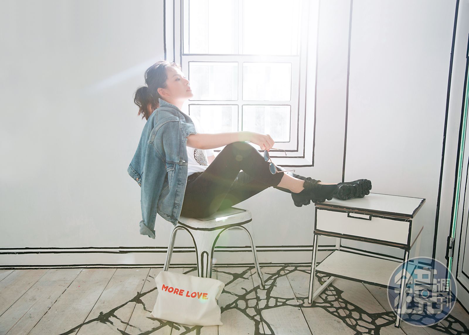 這套服裝搭配,完全就是平常的我自己啊!我最愛的就是T-Shirt、牛仔外套、跑步鞋這樣的穿著,外套的好處是在冷氣房中可以禦寒,熱了直接脫下,我平常包包內一定會有的就是外套與圍巾。我討厭很重的包包,很愛使用布質購物袋,覺得方便又好用。