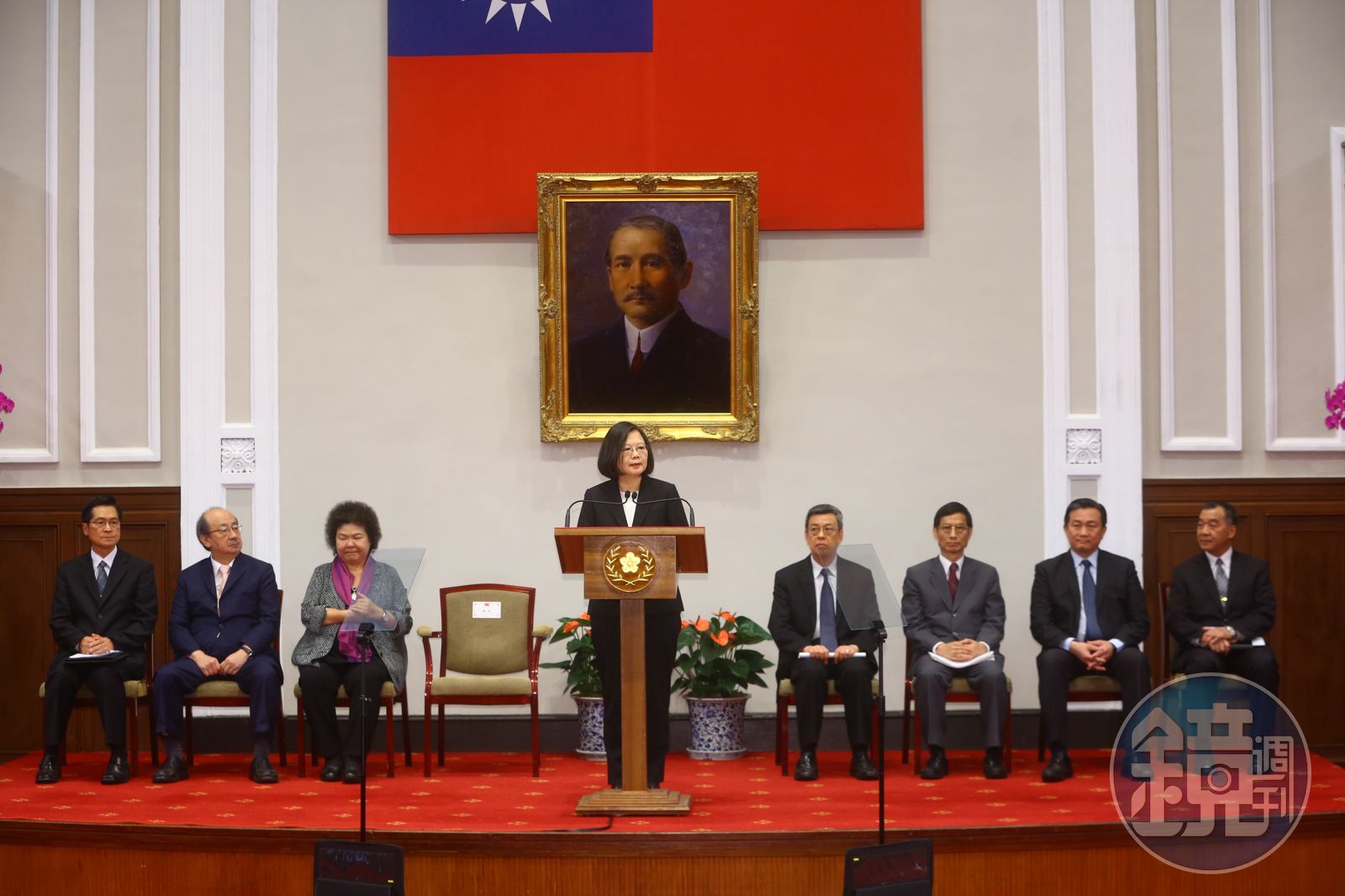 蔡總統今天是在身兼總統府年金改革委員會召集人的副總統陳建仁、總統府祕書長陳菊陪同下,與總統府年金改革委員會副召集人的政務委員林萬億、國防部長嚴德發、退輔會主委邱國正等人共同舉行記者會,說明年金改革制度政策。