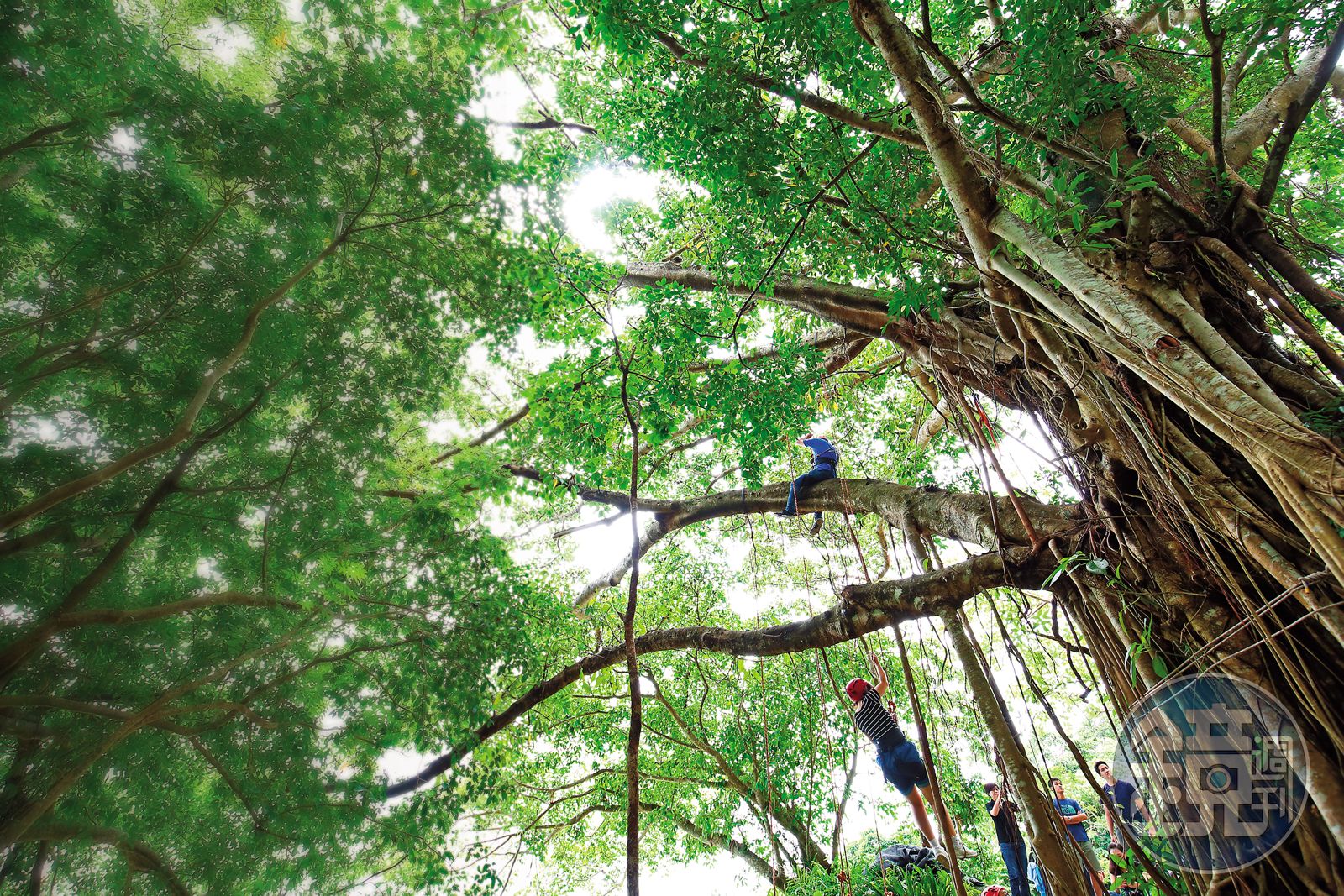 跟著攀樹體驗教練徐堅璽學打繩結、利用繩索慢慢上升,看似簡單動作,做起來卻不容易,一腳套上繩圈,雙手用力拉,原來想要一步登天還真難,不過費盡辛苦、爬上枝頭時,全然不同的開闊視野在眼前展開,還有太平洋海景相伴,真是無敵享受。