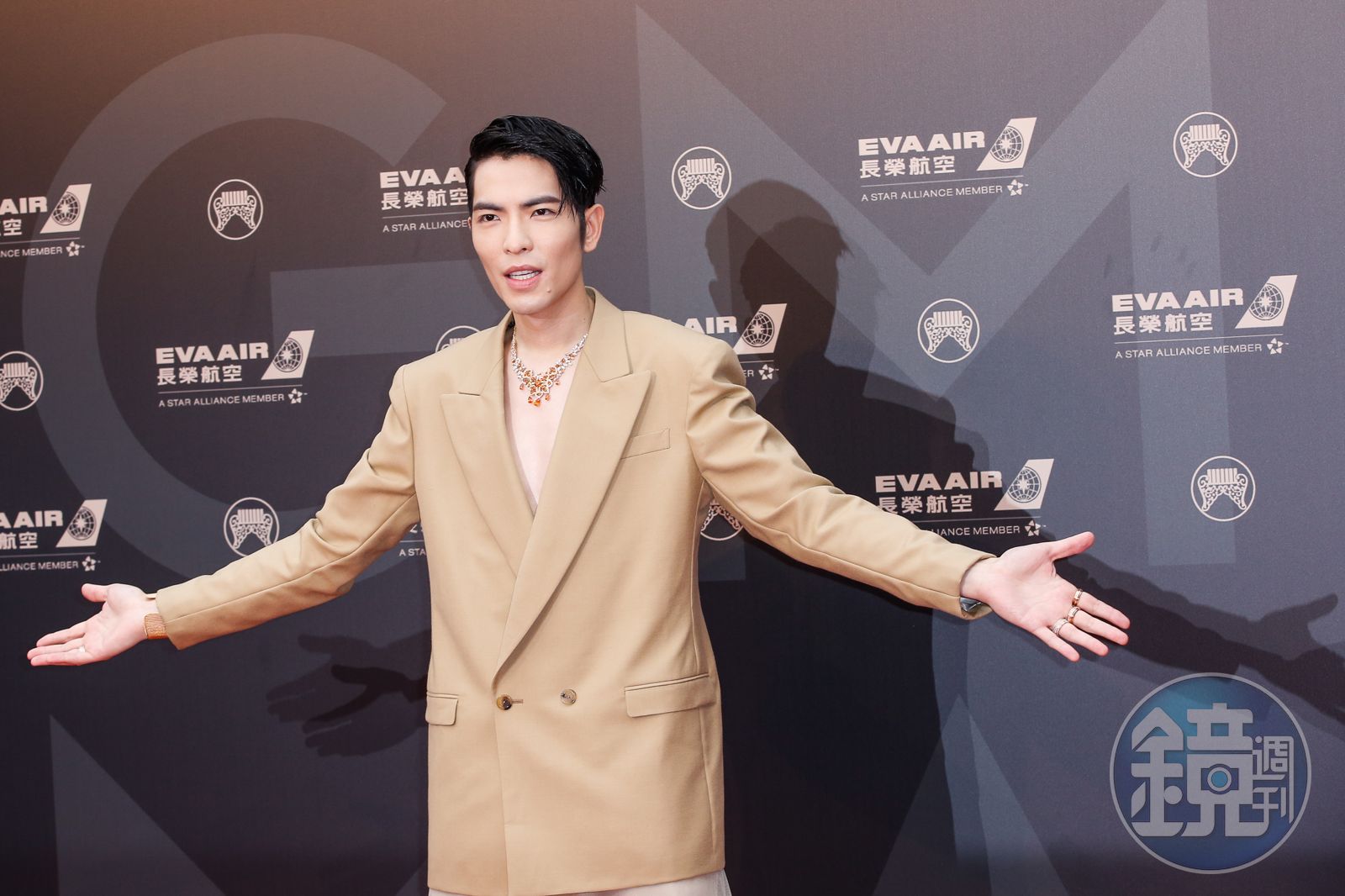 今年金曲獎意外的,男星比女星更大膽,打頭陣的典禮主持人蕭敬騰一身深V西裝,秀出排骨胸,讓人印象深刻。他穿駝色西裝外套,戴上昂貴珠寶項鍊,呈現出特色的中型氣質,還差點露點,成為本屆金曲獎的第一句驚嘆。