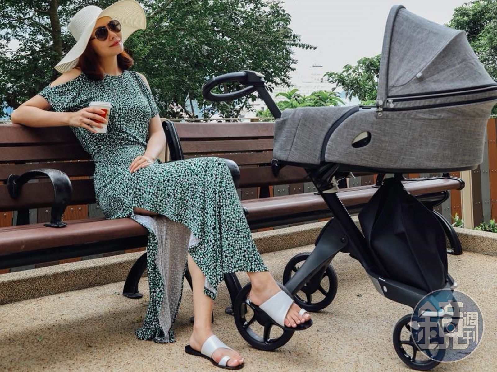 照片中顯示,穿著綠色長洋裝的熊黛林,戴著墨鏡和帽子,一副悠閒的樣子在公園裡,2個月的女兒則在嬰兒車上,母女3人在好天氣出來曬太陽散步。