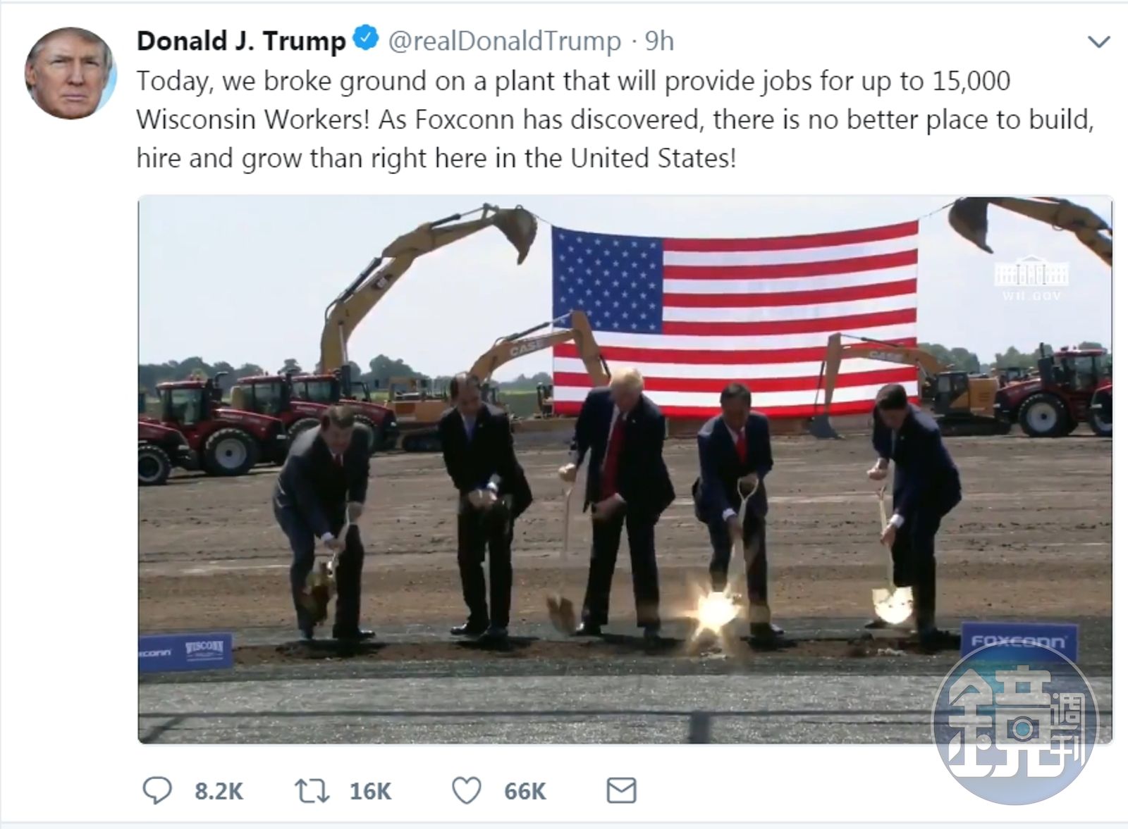 為了宣揚這份100億美元的大投資,川普在出席威州廠動土的前後,都上推特宣揚政績。他在前往鴻海威州廠之前,就在推特上發言:「我在威州密爾瓦基,來開會。很快要前往富士康(鴻海)盛大動土典禮,富士康將在威州興建很棒的新電子工廠,有1.5萬個工作機會,太棒了!」