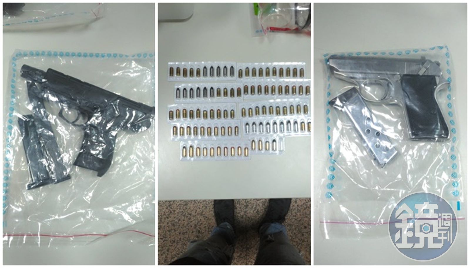 警方隨後在現場查後改造手槍3支 、彈夾5個、改造子彈94顆、已通槍管6支、彈頭209顆、改造工具3批、子彈壓製機1臺、海洛因及安非他命、吸食器3組、點鈔機1臺、贓款共新臺幣20萬4,700元。