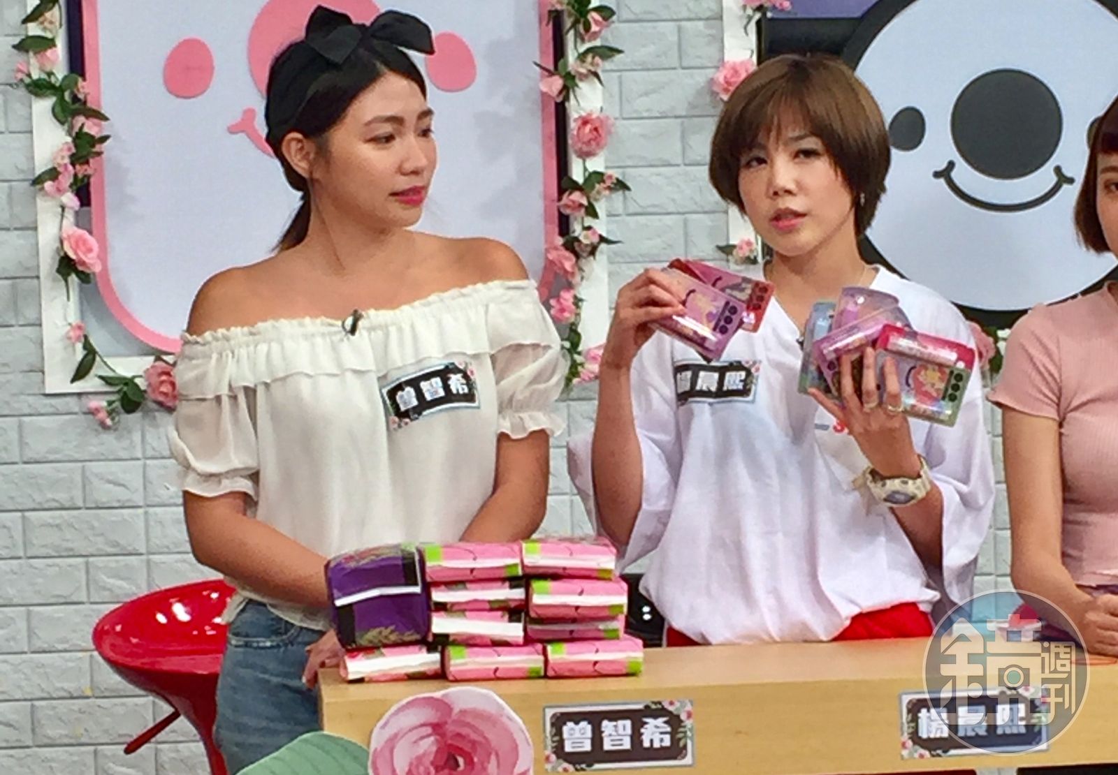 5位美女囤貨族拉著行李箱到場應戰,曾智希坦言自己非常愛囤「衛生棉」,她說:「小時候我沒有買過衛生棉,現在我家隨時會有一整個櫃子都裝衛生棉,我媽也很愛囤,我這個習慣是來自我媽媽!」現場帶來她新發現愛囤的草本衛生棉,現場眾女生聽到有「暖子宮」的神奇功效,紛紛很有興趣想試。