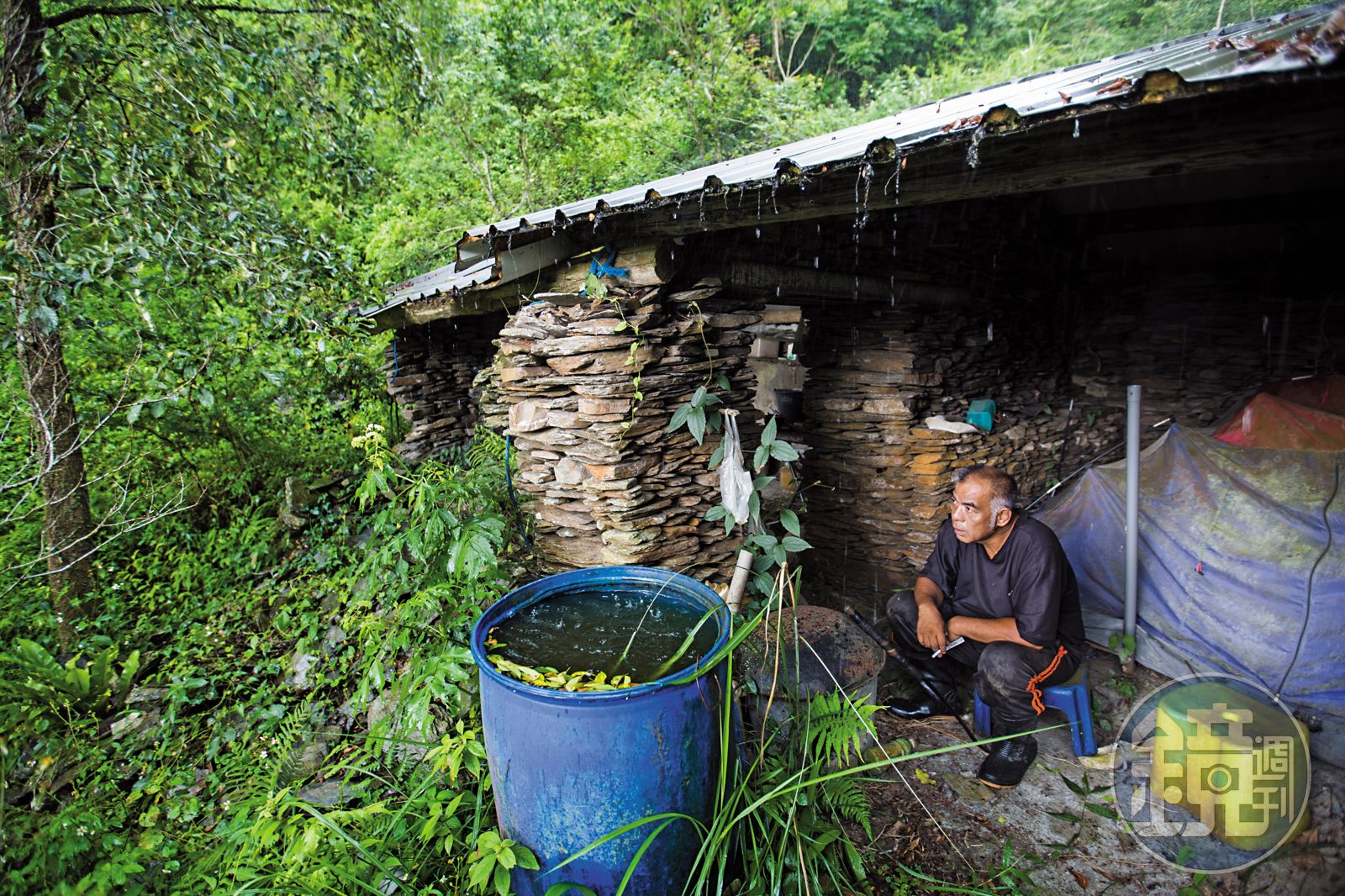 宋文生(Sula Sukimadimi)邊砍草,邊帶我們走向他就地取材以頁岩石板、木頭搭建的工寮,這時來了場大雨,山林天氣詭譎莫測,說變就變。