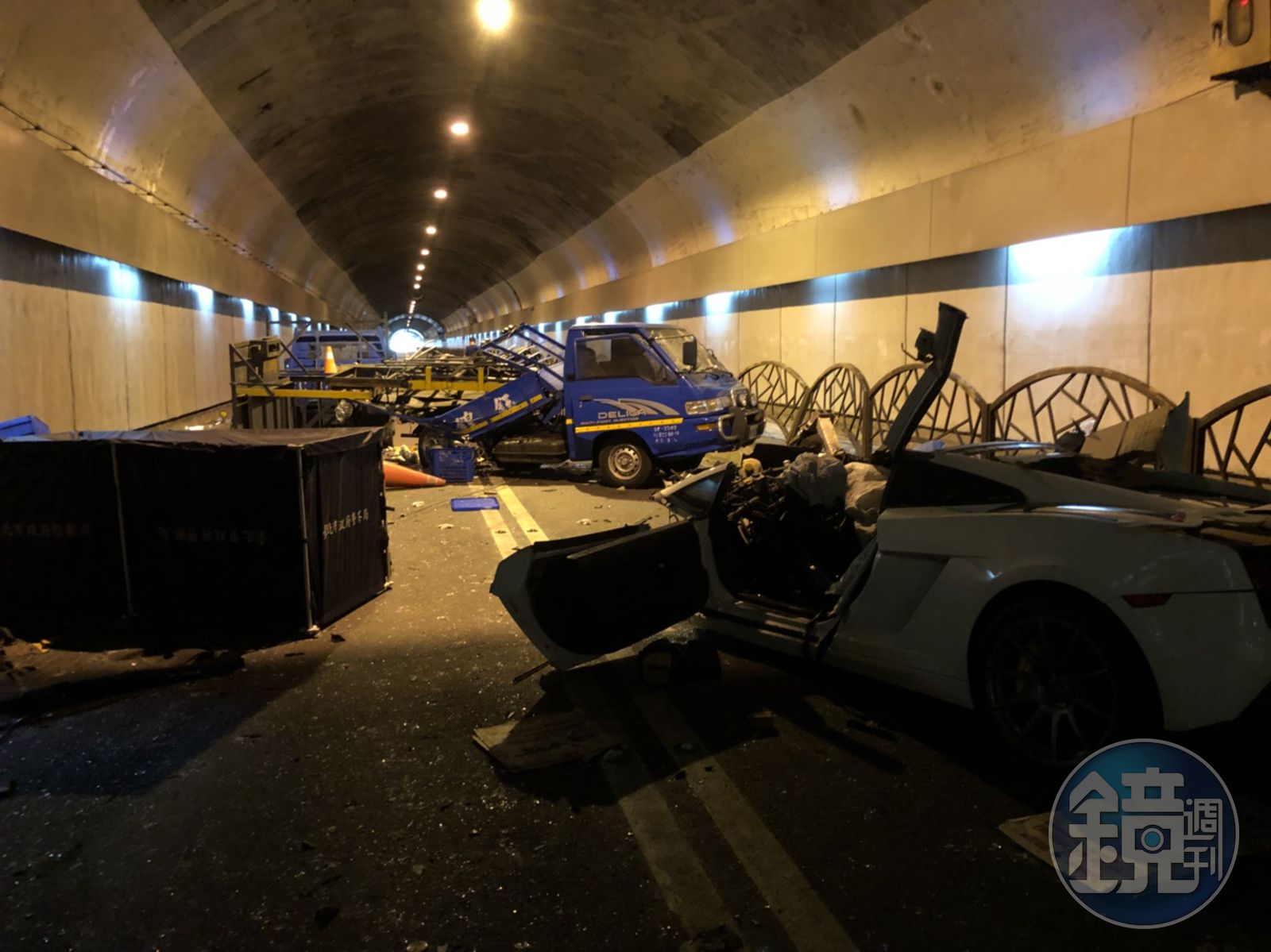 由24歲游男駕駛的藍寶堅尼在自強隧道內撞上施工中的工程車,除造成副駕駛座劉姓女伴死亡外,更造成施工人員1死2重傷。(警方提供)發布時間:2018.07.07 11:56 臺北時間