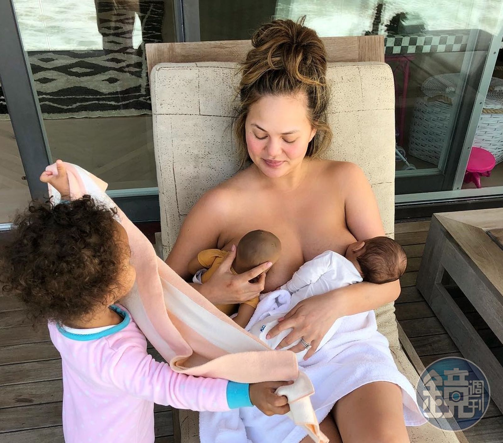 原來是約翰傳奇與克莉西泰根2歲大的女兒露娜,看見媽媽為弟弟哺乳,表示自己的嬰兒公仔肚子也餓了,要求媽媽也要親餵公仔,於是就出現邁爾斯吸左乳,公仔吸右乳的的好笑照片,露娜還在一旁拿著毛巾守護,就像個哺乳小幫手。克莉西隨後發文笑稱「露娜要我哺乳她的嬰兒公仔,我猜我現在有了一對雙胞胎吧!」