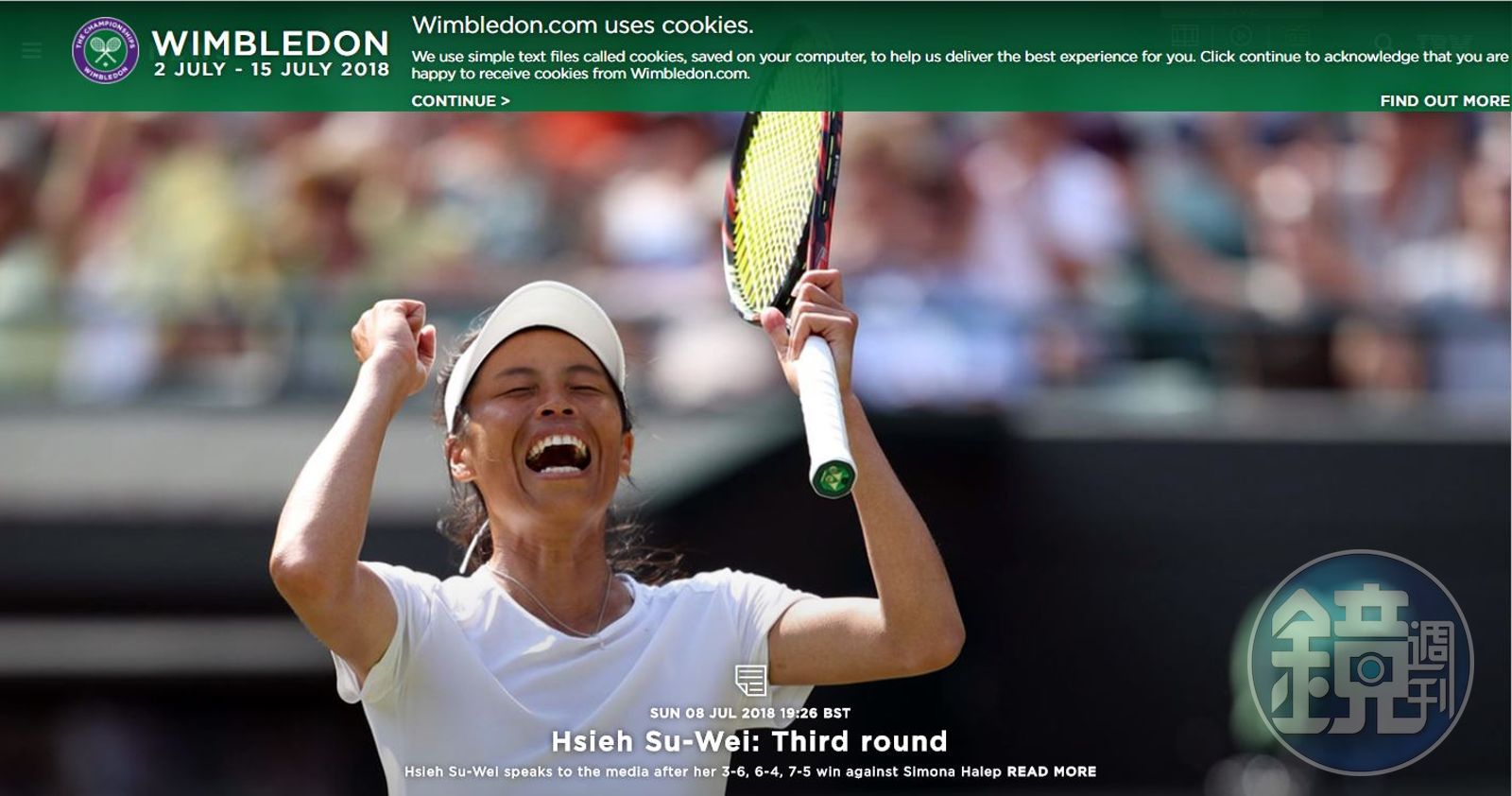 原排名第48的謝淑薇於7日第三輪賽事中,以逆轉勝之姿,擊敗排名第1的世界球后哈勒普(Simona Halep),挺進溫布頓網球賽16強。大爆冷門的精彩表現讓她登上溫網首頁,更締造她個人及台灣女子選手在溫網的最佳紀錄。