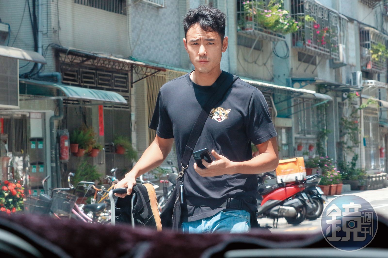 阮經天推著行李箱出門,看到本刊記者,還笑了一下說他要準備出國了。發布時間:2018.07.11 04:59 臺北時間