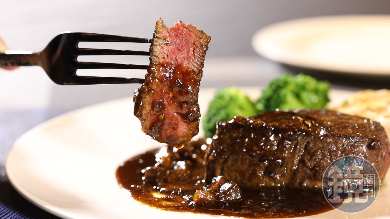 - 將靜置後的牛排重新放入熱鍋中加熱,放入奶油塊,以油淋的方式讓牛排呈深褐色,並帶點榛果香氣。