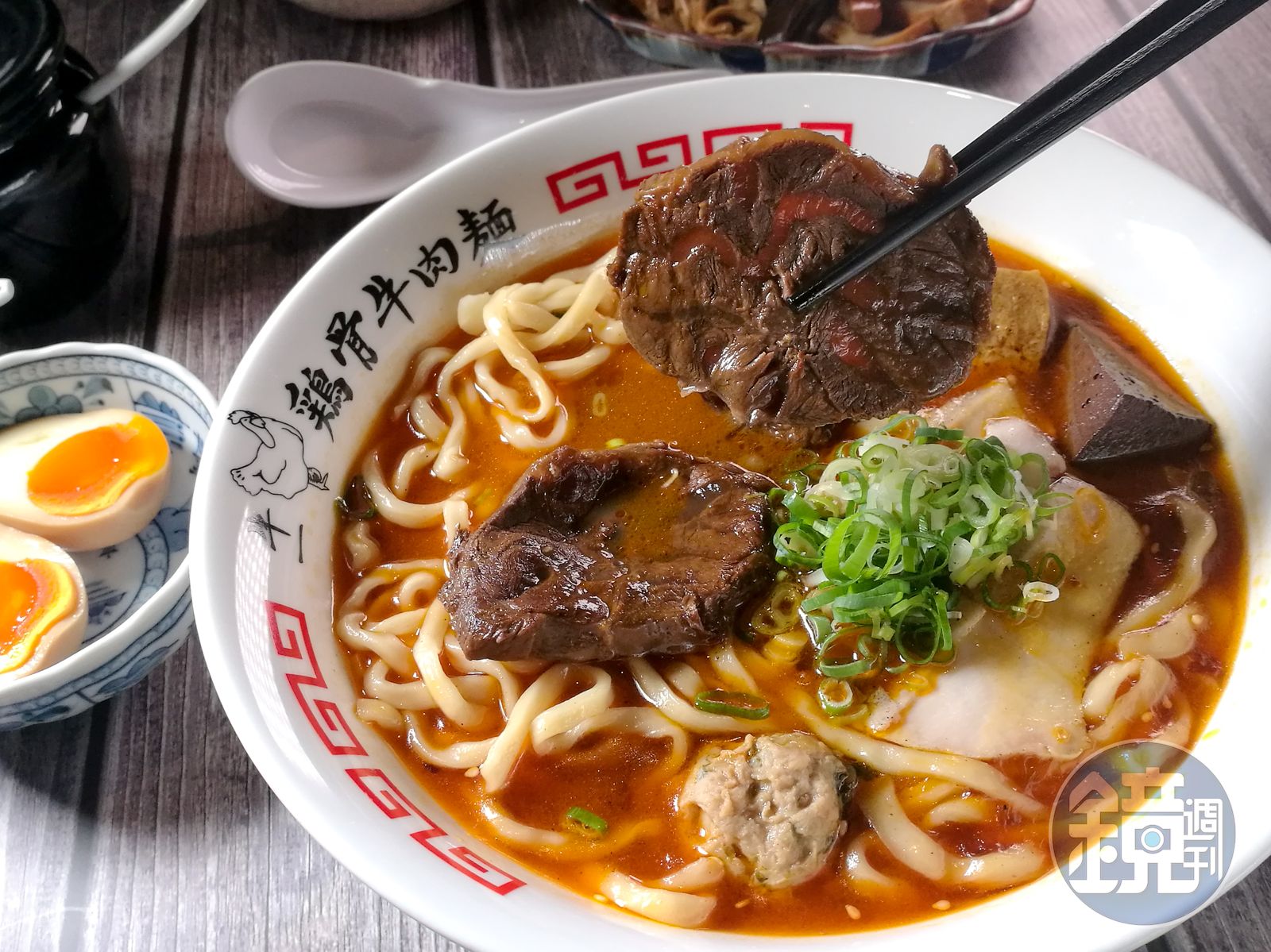 「麵屋牛一雞骨牛肉麵」由3位有日料經驗的男生合夥,老闆之一侯建同說:「最能代表台灣的麵食就是牛肉麵,我們想用職人煮拉麵的精神煮好台灣的麵。」這裡用濃郁系或淡麗系的風味對應紅燒或清燉的牛肉湯頭,麵條選用厚0.6公分、寬約2公分的中式麵條,保留牛肉麵應有粗獷耐嚼的特色。