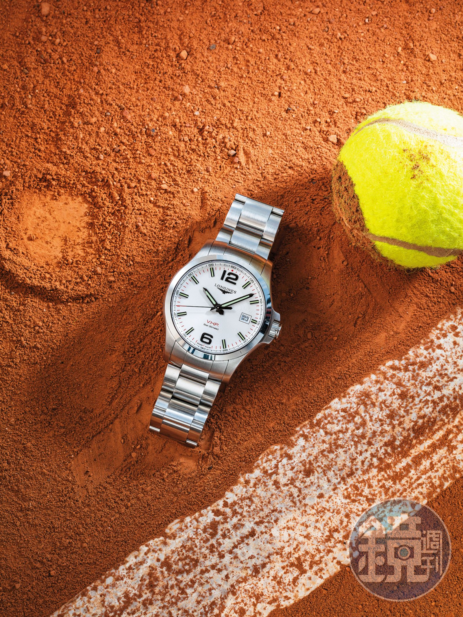 1枚躺在紅土地上的浪琴錶,與1顆鮮黃的球。說明每年最重要的4大網球賽事之一「法國網球公開賽」,每每衝擊球迷與錶迷的心。